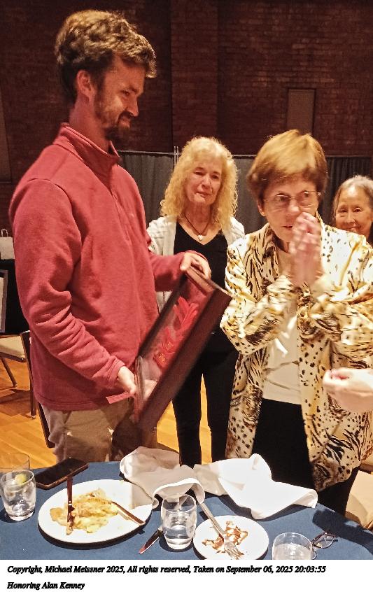 Picture #1: Honoring Alan Kenney Thumb: 375x500, 46,585 bytes (46K) Small: 750x1023, 157,618 bytes (154K), (html file) Copyright, Michael Meissner 2025, All rights reserved Samsung A32 5G phone f/1.8, ISO 1250, 1/20 sec, 4.6mm, auto mode, center weight metering 35mm equivalent focal length 25.0mm Programs used: crop, raw therapee, rotate right Taken by Michael Meissner on September 06, 2025 20:03:53 Last modified on September 13, 2025 at 21:19 |