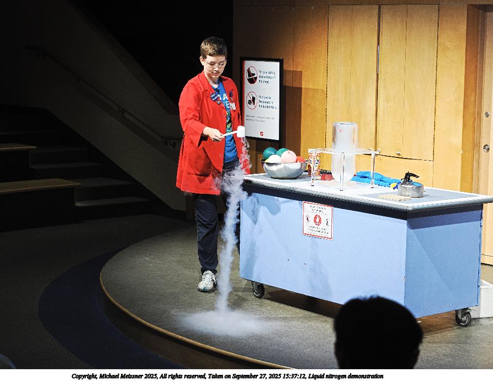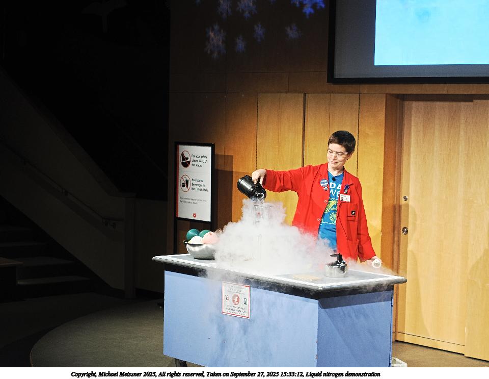 Picture #3: Liquid nitrogen demonstration #3 Thumb: 480x360, 43,524 bytes (43K) Small: 960x743, 93,391 bytes (92K), (html file) Copyright, Michael Meissner 2025, All rights reserved OM OM1 camera with Olympus-m43 12-40mm f/2.8 lens f/2.8, ISO 320, 1/80 sec, 38.0mm, auto mode, vivid color, matrix metering, IS Auto, anti-shock 35mm equivalent focal length 76.0mm Programs used: crop, raw therapee Taken by Michael Meissner on September 27, 2025 15:33:52 Last modified on September 28, 2025 at 02:26 |
