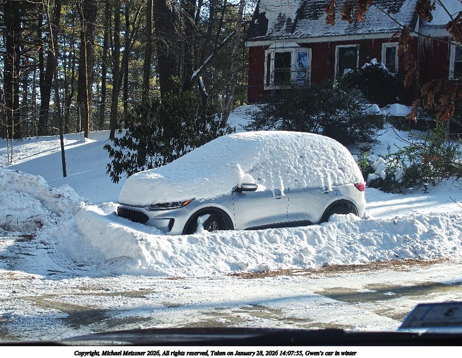 Picture #11: Gwen's car in winter 900x698, 217,445 bytes (213K), (html file) Copyright, Michael Meissner 2026, All rights reserved Olympus Stylus-1 camera f/3.5, ISO 100, 1/400 sec, 12.0mm, auto mode, vivid color, SHQ, matrix metering, IS Auto, noise reduction auto 35mm equivalent focal length 57.0mm Programs used: crop, raw therapee Taken by Michael Meissner on January 28, 2026 14:07:55 Last modified on January 29, 2026 at 18:25 |