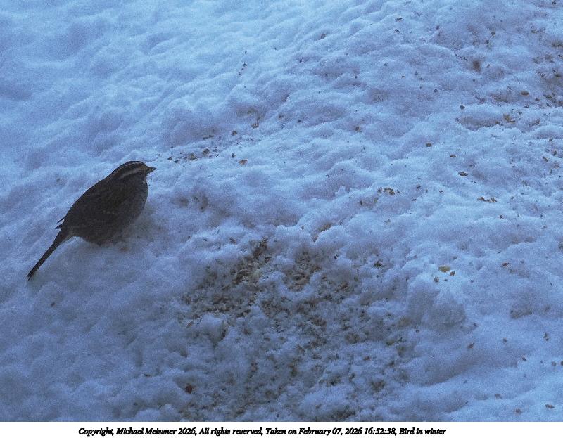Picture #1: Bird in winter Thumb: 480x360, 52,072 bytes (51K) Small: 800x623, 114,543 bytes (112K), (html file) Copyright, Michael Meissner 2026, All rights reserved OM OM3 camera with Olympus-m43 12-40mm f/2.8 lens f/2.8, ISO 640, 1/1000 sec, 40.0mm, auto mode, vivid color, matrix metering, bias -0.3, auto + manual focus, IS Auto, face detection, subject birds (not found) 35mm equivalent focal length 80.0mm Programs used: gimp, raw therapee Taken by Michael Meissner on February 07, 2026 16:38:12 Last modified on February 07, 2026 at 18:06 |