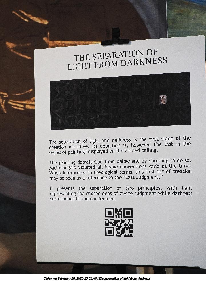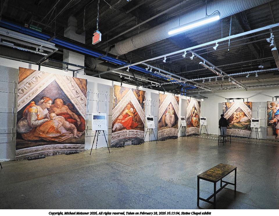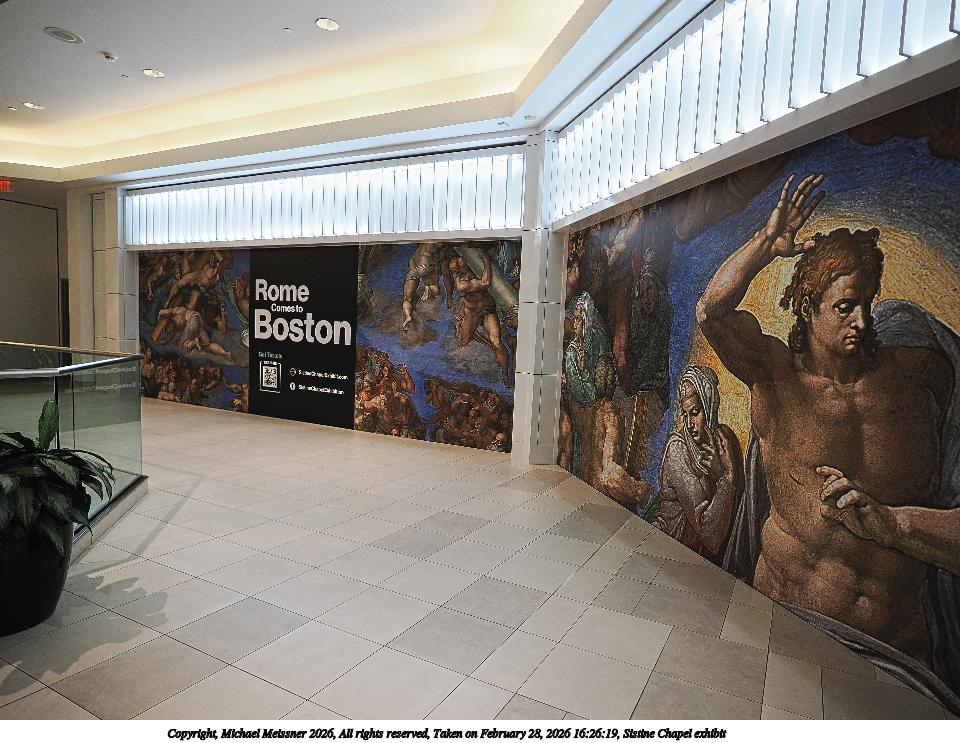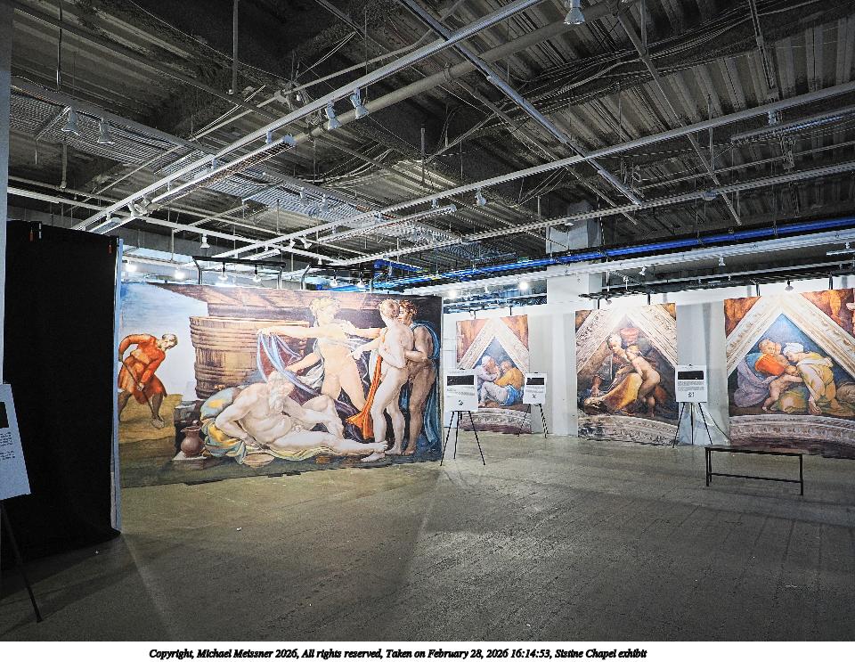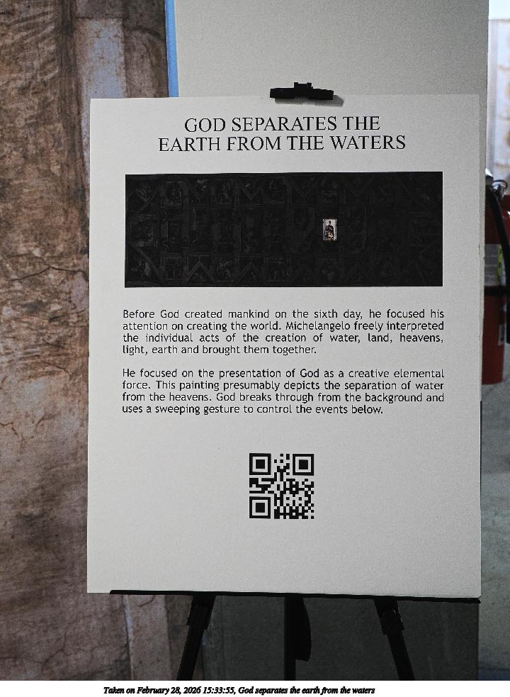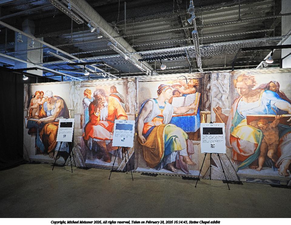 Picture #77: Sistine Chapel exhibit #4 Thumb: 480x360, 60,275 bytes (59K) Small: 960x743, 200,530 bytes (196K), (html file) Copyright, Michael Meissner 2026, All rights reserved OM OM3 camera with Panasonic-Leica 9mm f/1.7 lens f/1.8, ISO 640, 1/60 sec, 9.0mm, auto mode, vivid color, matrix metering, bias -0.3, continous focus, IS Auto, face detection, anti-shock 35mm equivalent focal length 18.0mm Programs used: crop, raw therapee Taken by Michael Meissner on February 28, 2026 16:15:04 Last modified on February 28, 2026 at 23:35 |