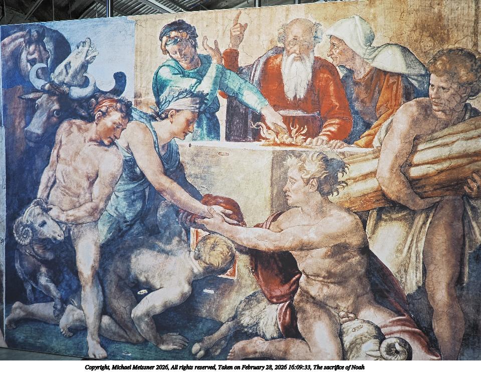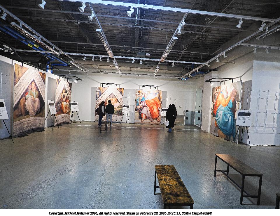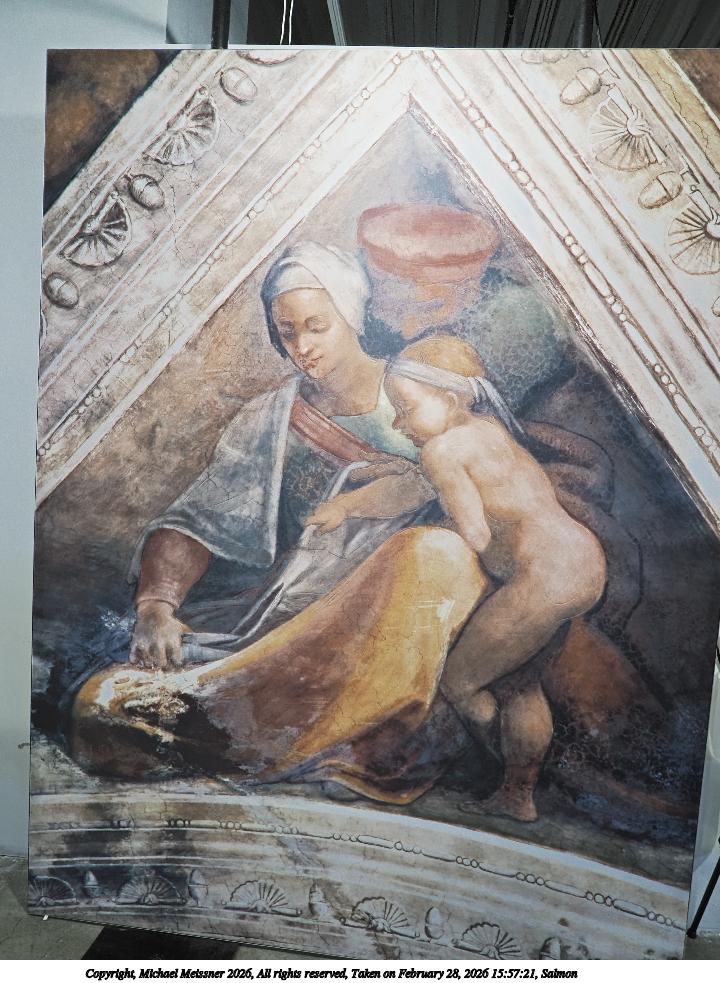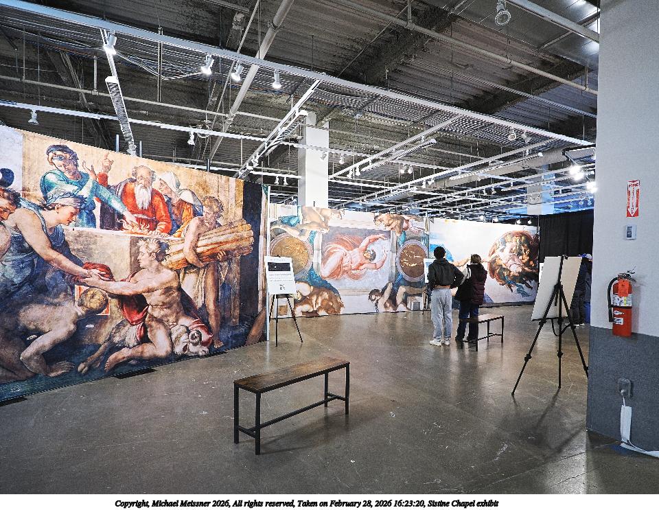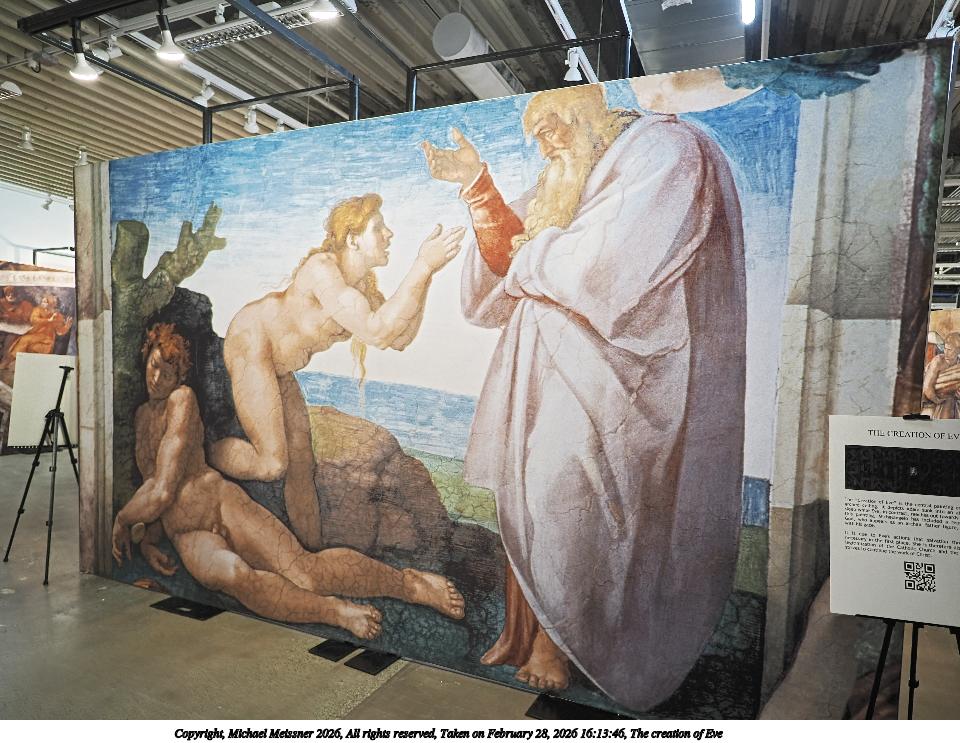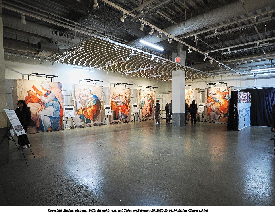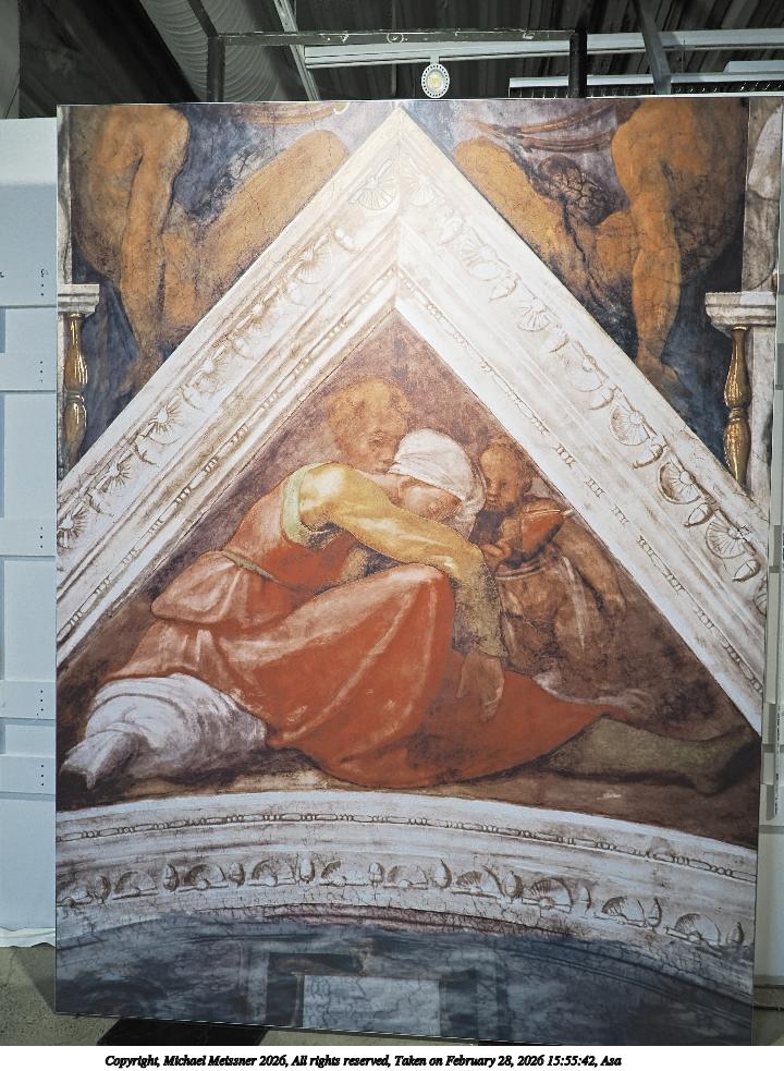 Picture #77: Sistine Chapel exhibit #4 Thumb: 480x360, 60,275 bytes (59K) Small: 960x743, 200,530 bytes (196K), (html file) Copyright, Michael Meissner 2026, All rights reserved OM OM3 camera with Panasonic-Leica 9mm f/1.7 lens f/1.8, ISO 640, 1/60 sec, 9.0mm, auto mode, vivid color, matrix metering, bias -0.3, continous focus, IS Auto, face detection, anti-shock 35mm equivalent focal length 18.0mm Programs used: crop, raw therapee Taken by Michael Meissner on February 28, 2026 16:15:04 Last modified on February 28, 2026 at 23:35 |