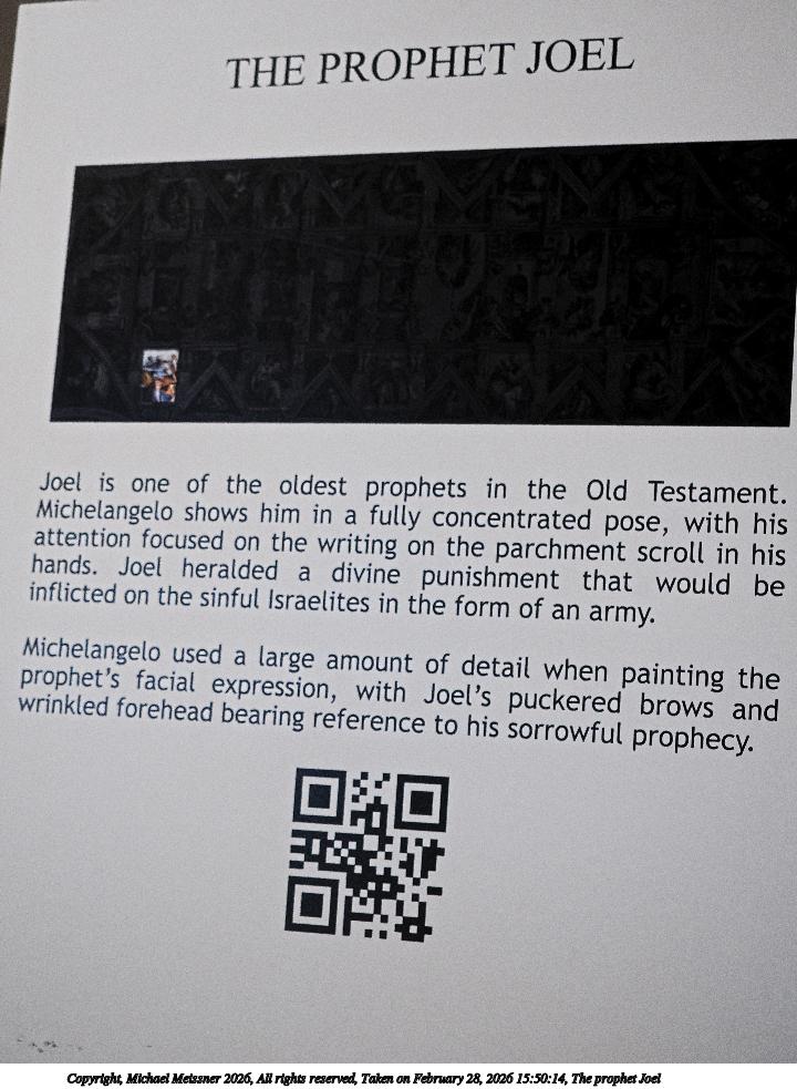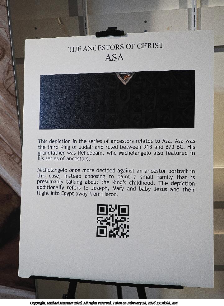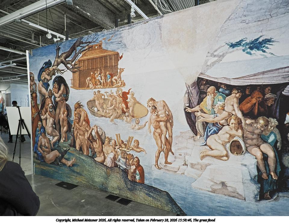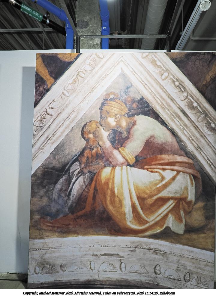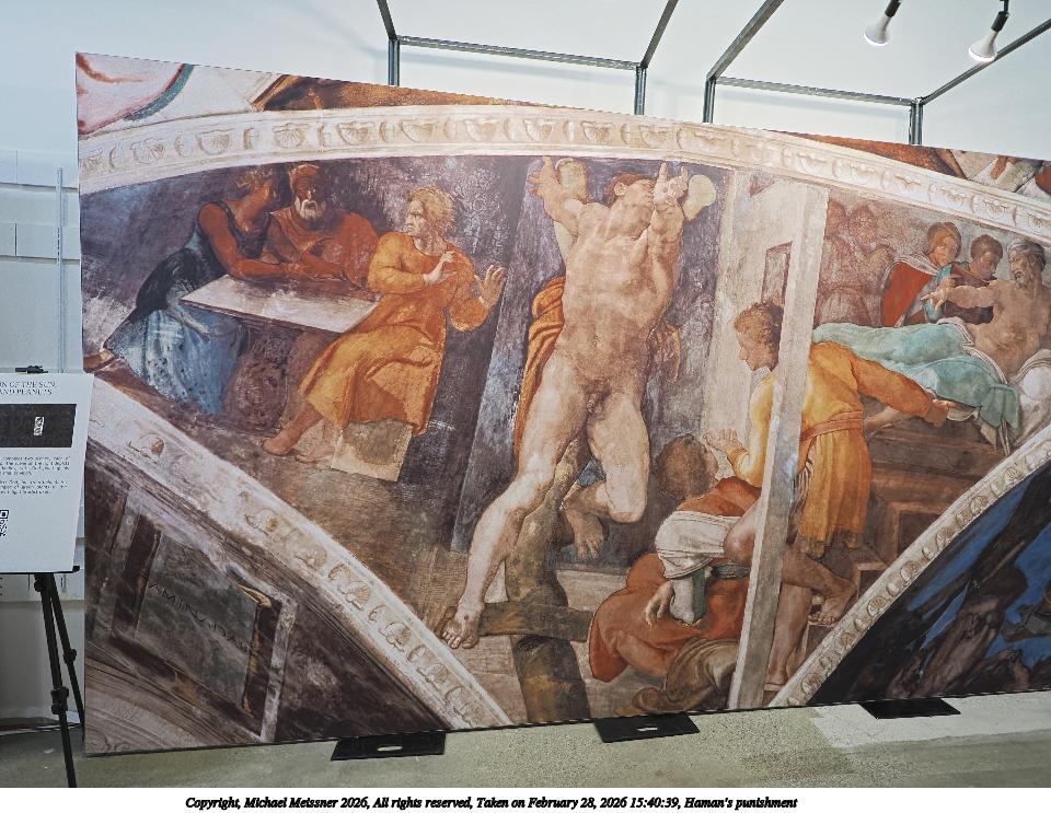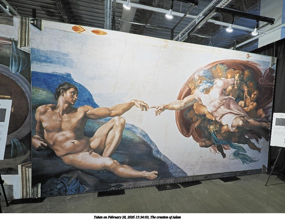 Picture #77: Sistine Chapel exhibit #4 Thumb: 480x360, 60,275 bytes (59K) Small: 960x743, 200,530 bytes (196K), (html file) Copyright, Michael Meissner 2026, All rights reserved OM OM3 camera with Panasonic-Leica 9mm f/1.7 lens f/1.8, ISO 640, 1/60 sec, 9.0mm, auto mode, vivid color, matrix metering, bias -0.3, continous focus, IS Auto, face detection, anti-shock 35mm equivalent focal length 18.0mm Programs used: crop, raw therapee Taken by Michael Meissner on February 28, 2026 16:15:04 Last modified on February 28, 2026 at 23:35 |