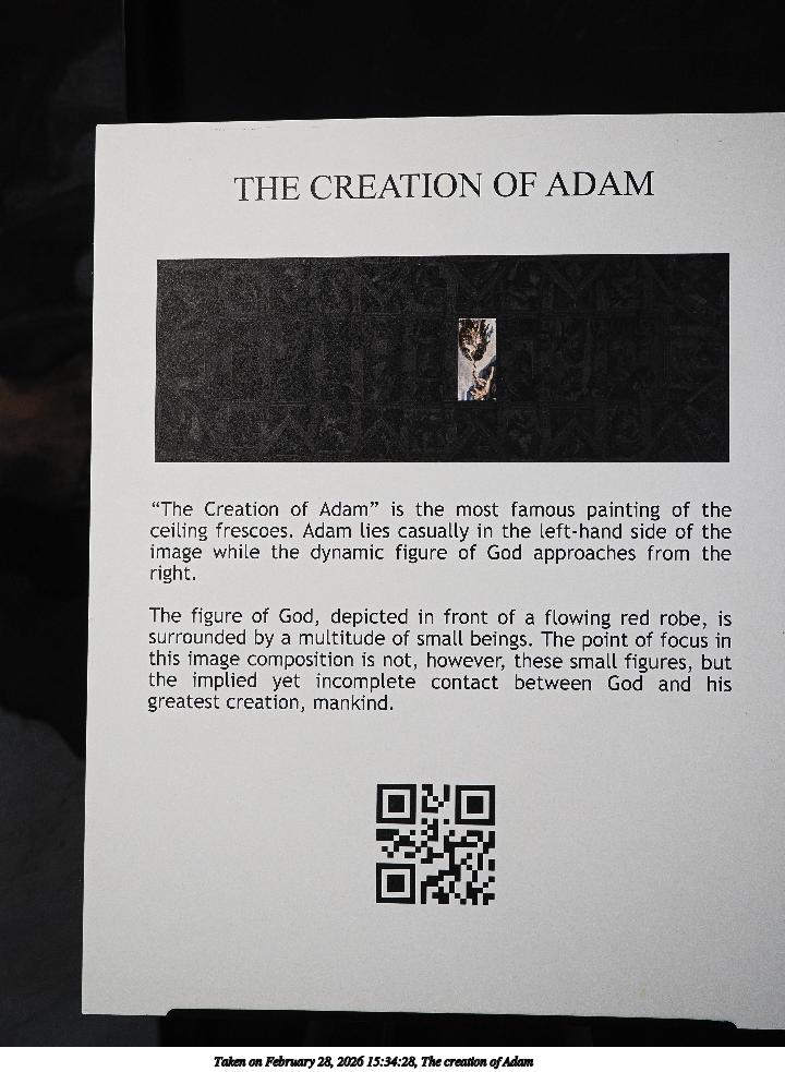 Picture #6: The creation of Adam Thumb: 360x480, 45,989 bytes (45K) Small: 720x983, 116,031 bytes (114K), (html file) OM OM1 camera with Olympus-m43 12-40mm f/2.8 lens f/2.8, ISO 400, 1/60 sec, 26.0mm, auto mode, vivid color, matrix metering, IS Auto, anti-shock 35mm equivalent focal length 52.0mm Programs used: crop, raw therapee, rotate left Taken by Michael Meissner on February 28, 2026 15:34:28 Last modified on February 28, 2026 at 22:33 |