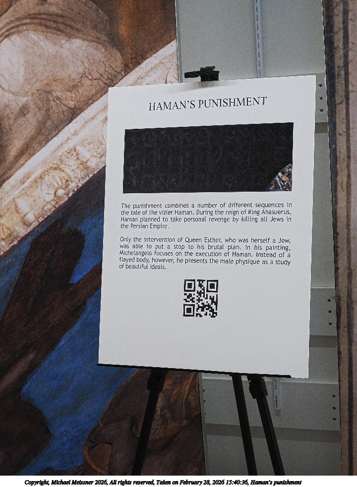 Picture #15: Haman's punishment #2 Thumb: 480x360, 59,777 bytes (59K) Small: 960x743, 165,599 bytes (162K), (html file) Copyright, Michael Meissner 2026, All rights reserved OM OM3 camera with Panasonic-Leica 9mm f/1.7 lens f/2.0, ISO 200, 1/40 sec, 9.0mm, auto mode, natural color, matrix metering, bias -0.3, IS Auto, stacked hdr2, face detection 35mm equivalent focal length 18.0mm Programs used: crop, raw therapee Taken by Michael Meissner on February 28, 2026 15:40:39 Last modified on February 28, 2026 at 22:09 |