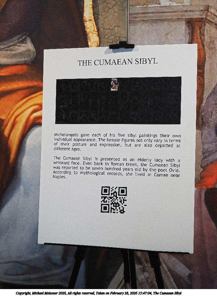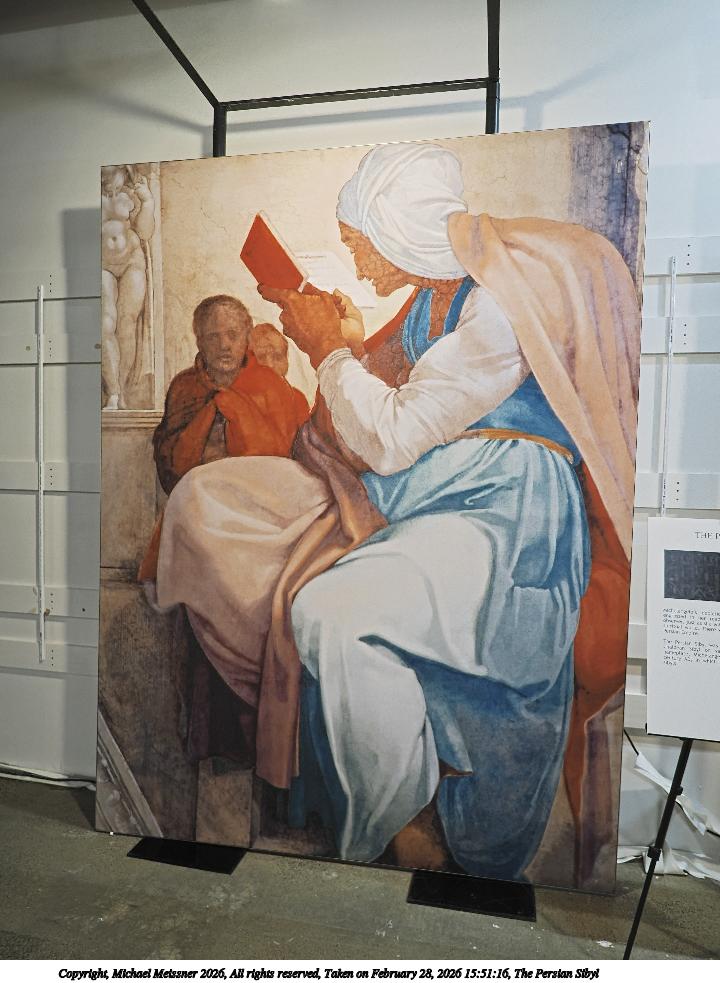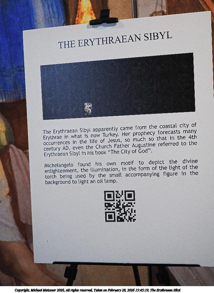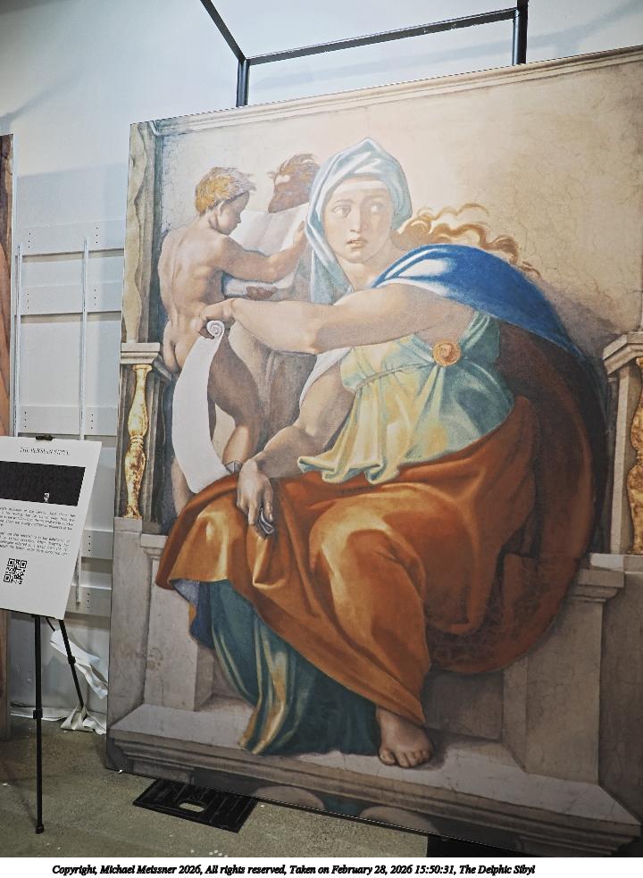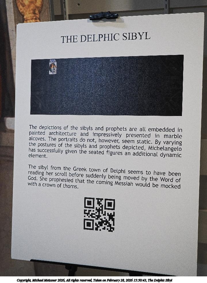 Picture #27: The Erythraean Sibyl #2 Thumb: 360x480, 60,792 bytes (60K) Small: 720x983, 160,523 bytes (157K), (html file) Copyright, Michael Meissner 2026, All rights reserved OM OM3 camera with Panasonic-Leica 9mm f/1.7 lens f/1.8, ISO 200, 1/30 sec, 9.0mm, auto mode, natural color, matrix metering, bias -0.3, IS Auto, stacked hdr2, face detection 35mm equivalent focal length 18.0mm Programs used: crop, raw therapee, rotate left Taken by Michael Meissner on February 28, 2026 15:45:22 Last modified on February 28, 2026 at 22:21 |