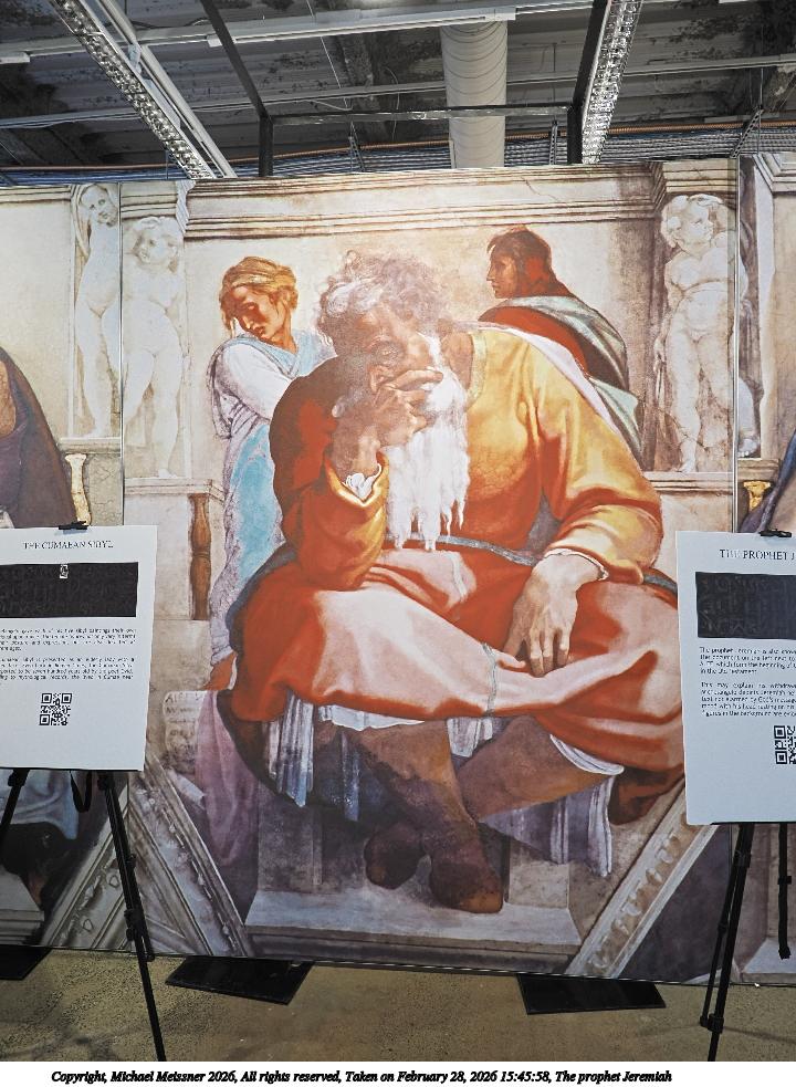Picture #28: The prophet Jeremiah Thumb: 360x480, 61,019 bytes (60K) Small: 720x983, 162,788 bytes (159K), (html file) Copyright, Michael Meissner 2026, All rights reserved OM OM3 camera with Panasonic-Leica 9mm f/1.7 lens f/1.8, ISO 200, 1/30 sec, 9.0mm, auto mode, natural color, matrix metering, bias -0.3, IS Auto, stacked hdr2, face detection 35mm equivalent focal length 18.0mm Programs used: crop, raw therapee, rotate left Taken by Michael Meissner on February 28, 2026 15:45:58 Last modified on February 28, 2026 at 22:22 |