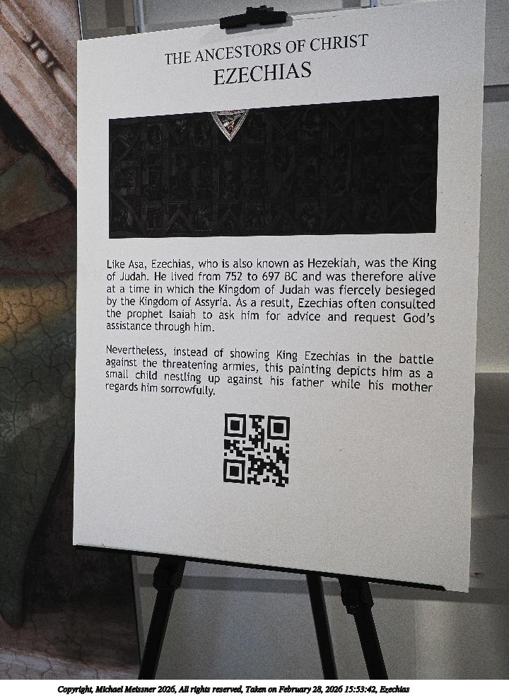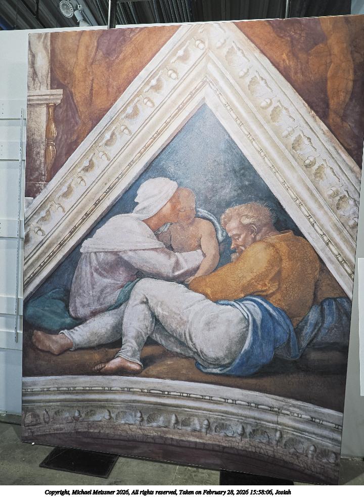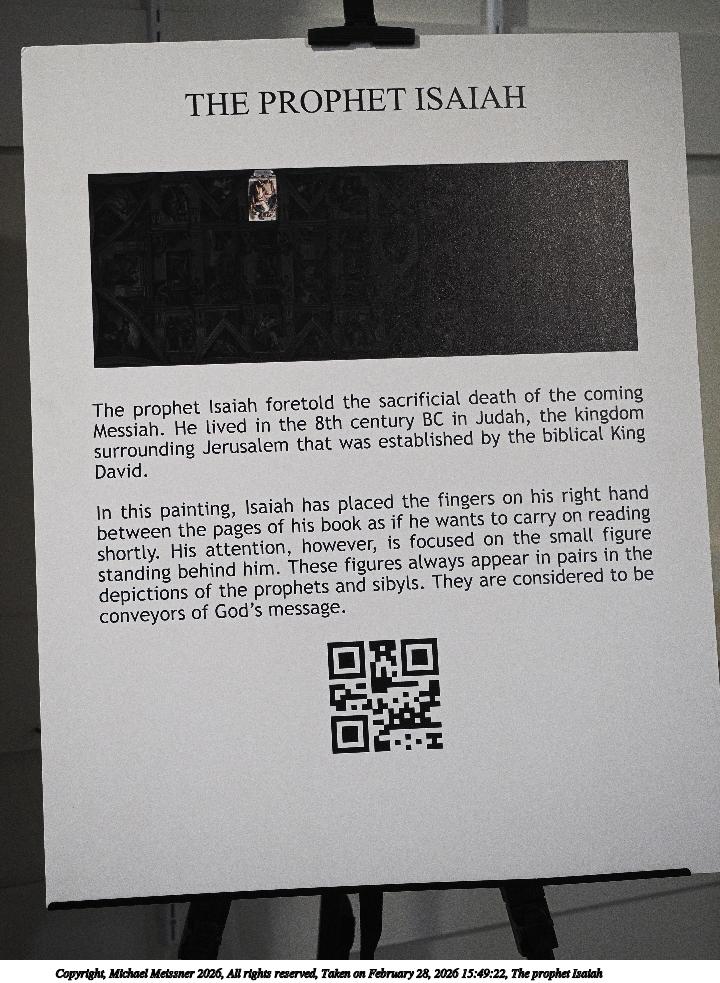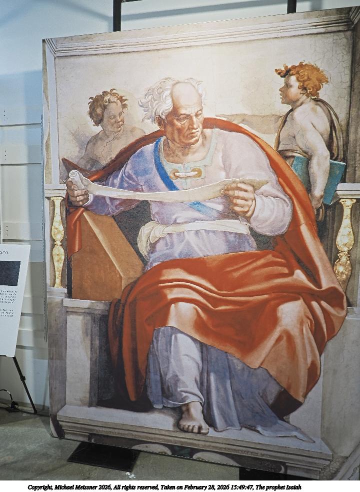 Picture #38: The prophet Isaiah #3 Thumb: 360x480, 54,967 bytes (54K) Small: 720x983, 134,618 bytes (132K), (html file) Copyright, Michael Meissner 2026, All rights reserved OM OM3 camera with Panasonic-Leica 9mm f/1.7 lens f/1.8, ISO 200, 1/30 sec, 9.0mm, auto mode, natural color, matrix metering, bias -0.3, IS Auto, stacked hdr2, face detection 35mm equivalent focal length 18.0mm Programs used: crop, raw therapee, rotate left Taken by Michael Meissner on February 28, 2026 15:49:47 Last modified on February 28, 2026 at 22:59 |