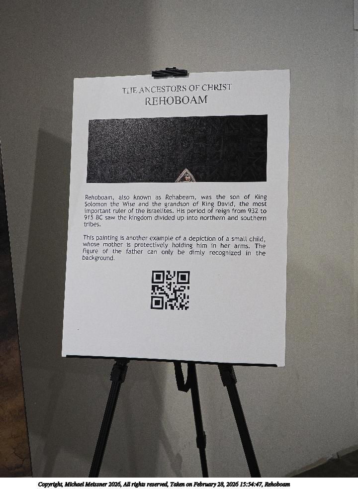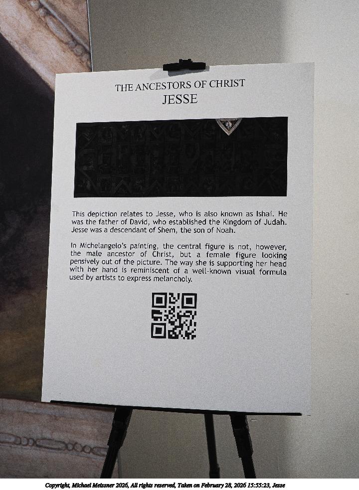Picture #79: The ancestors of Christ Thumb: 360x480, 53,007 bytes (52K) Small: 720x983, 165,960 bytes (163K), (html file) Copyright, Michael Meissner 2026, All rights reserved OM OM3 camera with Panasonic-Leica 9mm f/1.7 lens f/1.8, ISO 800, 1/60 sec, 9.0mm, auto mode, vivid color, matrix metering, continous focus, IS Auto, face detection, anti-shock 35mm equivalent focal length 18.0mm Programs used: crop, raw therapee, rotate left Taken by Michael Meissner on February 28, 2026 16:19:06 Last modified on February 28, 2026 at 23:37 |