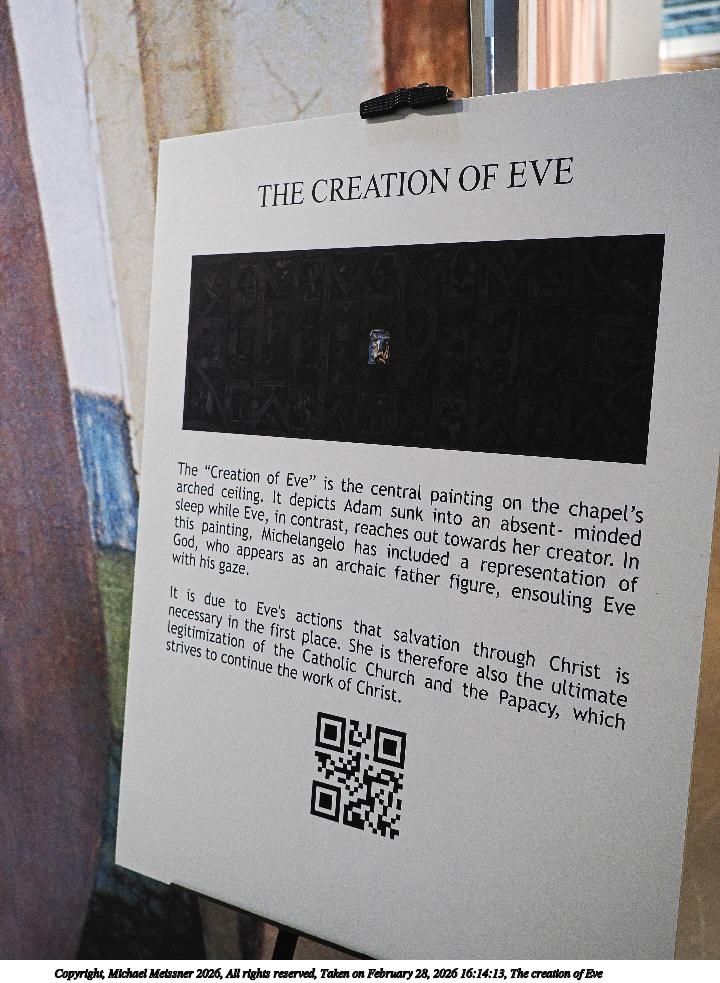 Picture #72: The creation of Eve Thumb: 480x360, 59,789 bytes (59K) Small: 960x743, 157,291 bytes (154K), (html file) Copyright, Michael Meissner 2026, All rights reserved OM OM3 camera with Panasonic-Leica 9mm f/1.7 lens f/2.0, ISO 200, 1/40 sec, 9.0mm, auto mode, natural color, matrix metering, bias -0.3, IS Auto, stacked hdr2, face detection 35mm equivalent focal length 18.0mm Programs used: crop, raw therapee Taken by Michael Meissner on February 28, 2026 16:13:46 Last modified on February 28, 2026 at 23:33 |