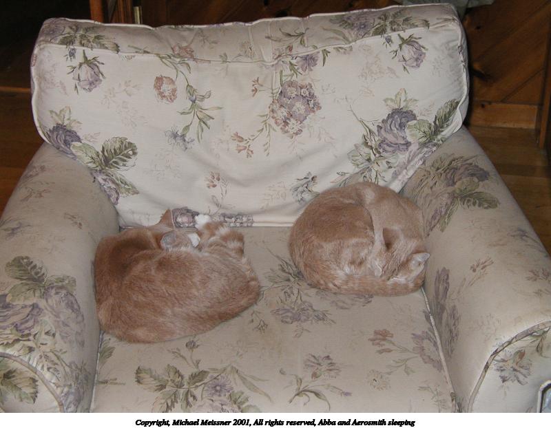 Picture #1: Abba and Aerosmith sleeping 800x622, 73,065 bytes (72K), (html file) Copyright, Michael Meissner 2001, All rights reserved Olympus D-510Z camera f/3.8, ISO 200, flash, 1/50 sec, 9.6mm, auto mode, HQ, matrix metering 35mm equivalent focal length 63.0mm Taken by Michael Meissner Last modified on June 06, 2002 at 22:42 |