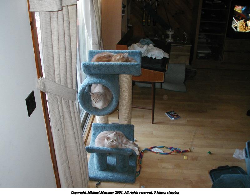Picture #5: 3 kittens sleeping #4 600x822, 89,220 bytes (88K), (html file) Copyright, Michael Meissner 2001, All rights reserved Olympus D-510Z camera f/3.4, ISO 200, flash, 1/40 sec, 7.8mm, auto mode, HQ, matrix metering 35mm equivalent focal length 51.0mm Taken by Michael Meissner Last modified on June 06, 2002 at 22:42 |