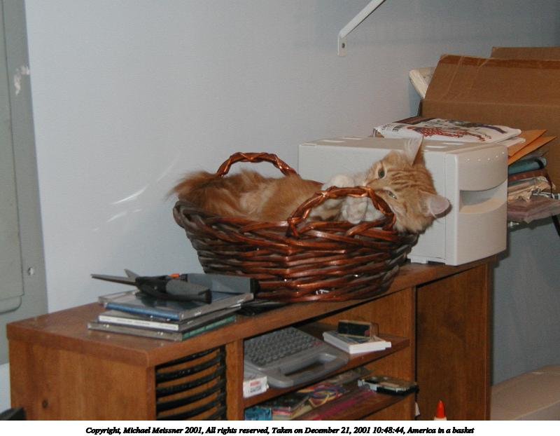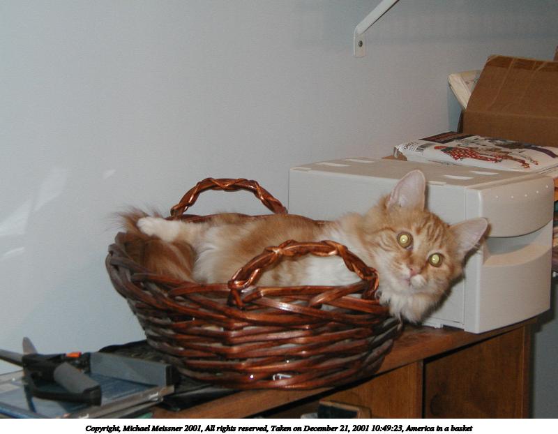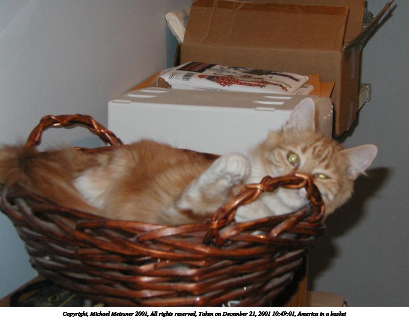 Picture #10: America in a basket #2 800x622, 63,022 bytes (62K), (html file) Copyright, Michael Meissner 2001, All rights reserved Olympus D-510Z camera f/4.0, ISO 200, flash, 1/60 sec, 11.5mm, auto mode, HQ, matrix metering 35mm equivalent focal length 75.0mm Taken by Michael Meissner on December 21, 2001 10:48:53 Last modified on June 06, 2002 at 22:42 |