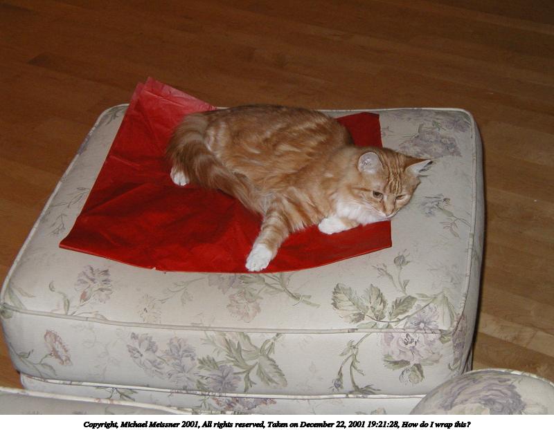 Picture #22: How do I wrap this? 800x622, 64,879 bytes (64K), (html file) Copyright, Michael Meissner 2001, All rights reserved Olympus D-510Z camera f/4.0, ISO 200, flash, 1/60 sec, 11.1mm, auto mode, HQ, matrix metering 35mm equivalent focal length 72.0mm Taken by Michael Meissner on December 22, 2001 19:21:28 Last modified on June 06, 2002 at 22:43 |
