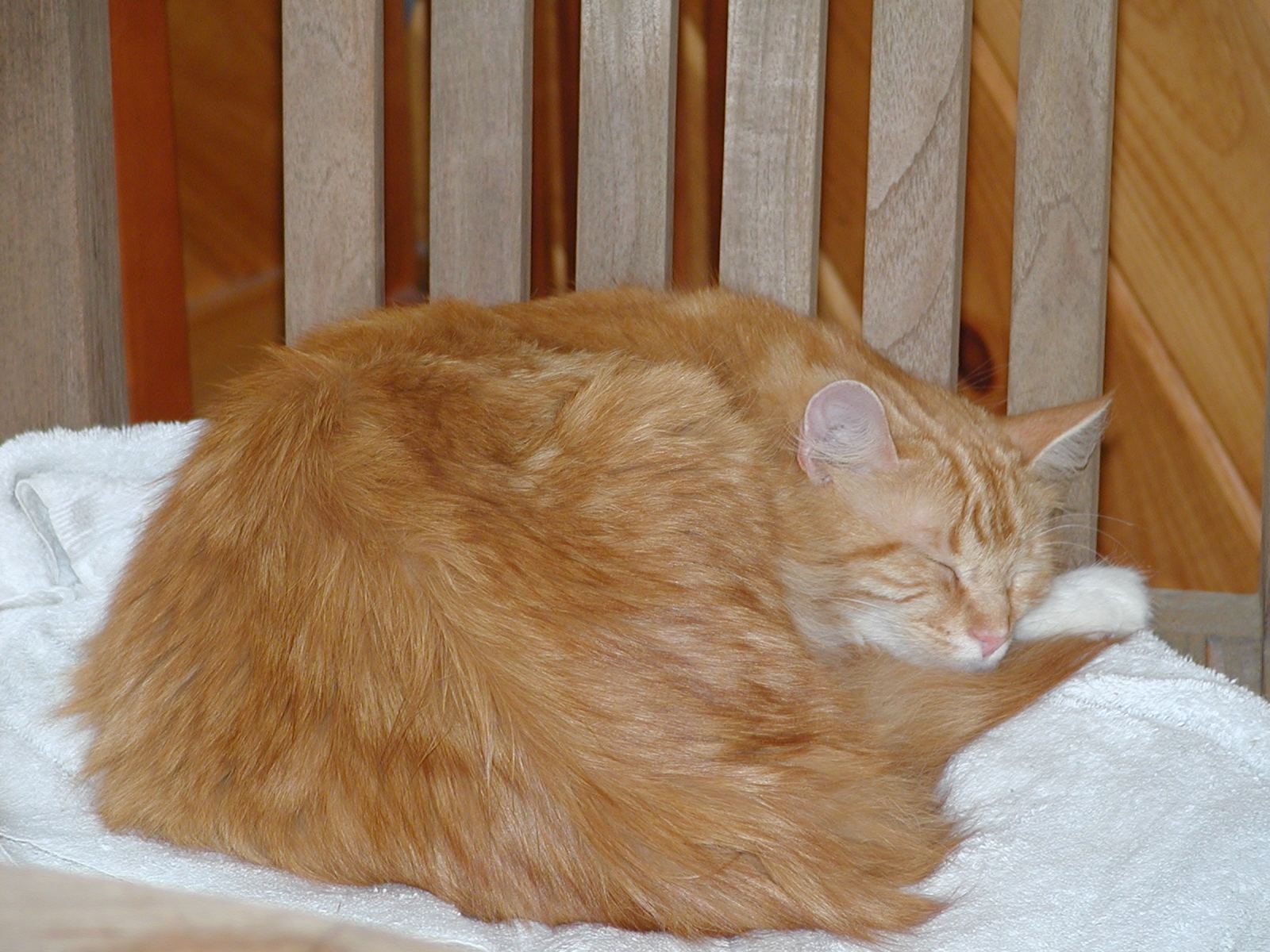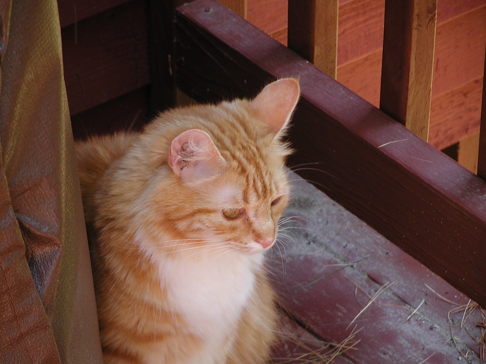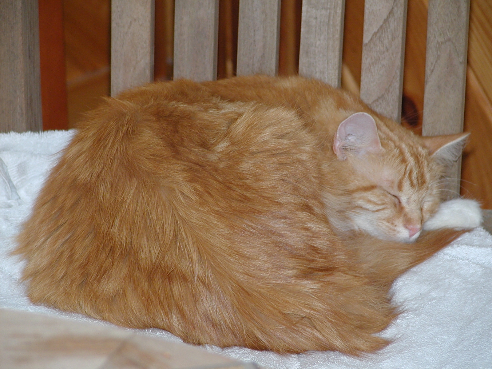 Picture #10: Let sleeping cats lie #3 Small: 600x822, 118,669 bytes (116K), (html file) Large: 1200x1600, 1,480,552 bytes (1.4M), (html file) Copyright, Michael Meissner 2002, All rights reserved Olympus C-2100UZ camera f/5.6, ISO 100, 1/125 sec, 34.1mm, manual mode, SHQ, matrix metering 35mm equivalent focal length 189.0mm Taken by Michael Meissner on July 28, 2002 13:37:23 Last modified on July 30, 2002 at 00:06 Shutter speed of 1/125 or 1/250 may indicate use of flash |