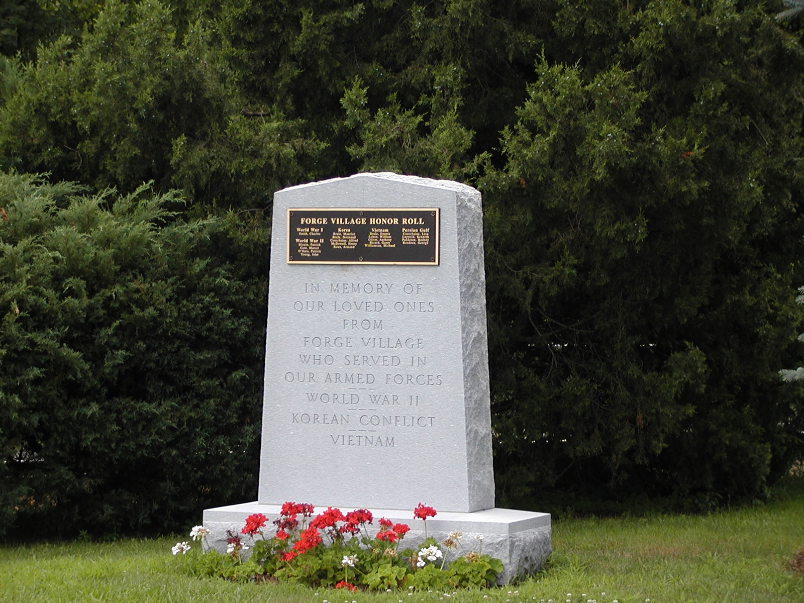 Picture #166: Forge Village war memorial Small: 800x622, 125,199 bytes (123K), (html file) Large: 1600x1200, 1,433,891 bytes (1.4M), (html file) Copyright, Michael Meissner 2002, All rights reserved Olympus C-2100UZ camera f/3.2, ISO 100, 1/500 sec, 7.0mm, auto mode, SHQ, matrix metering 35mm equivalent focal length 39.0mm Taken by Michael Meissner on August 08, 2002 14:25:50 Last modified on August 08, 2002 at 16:27 |