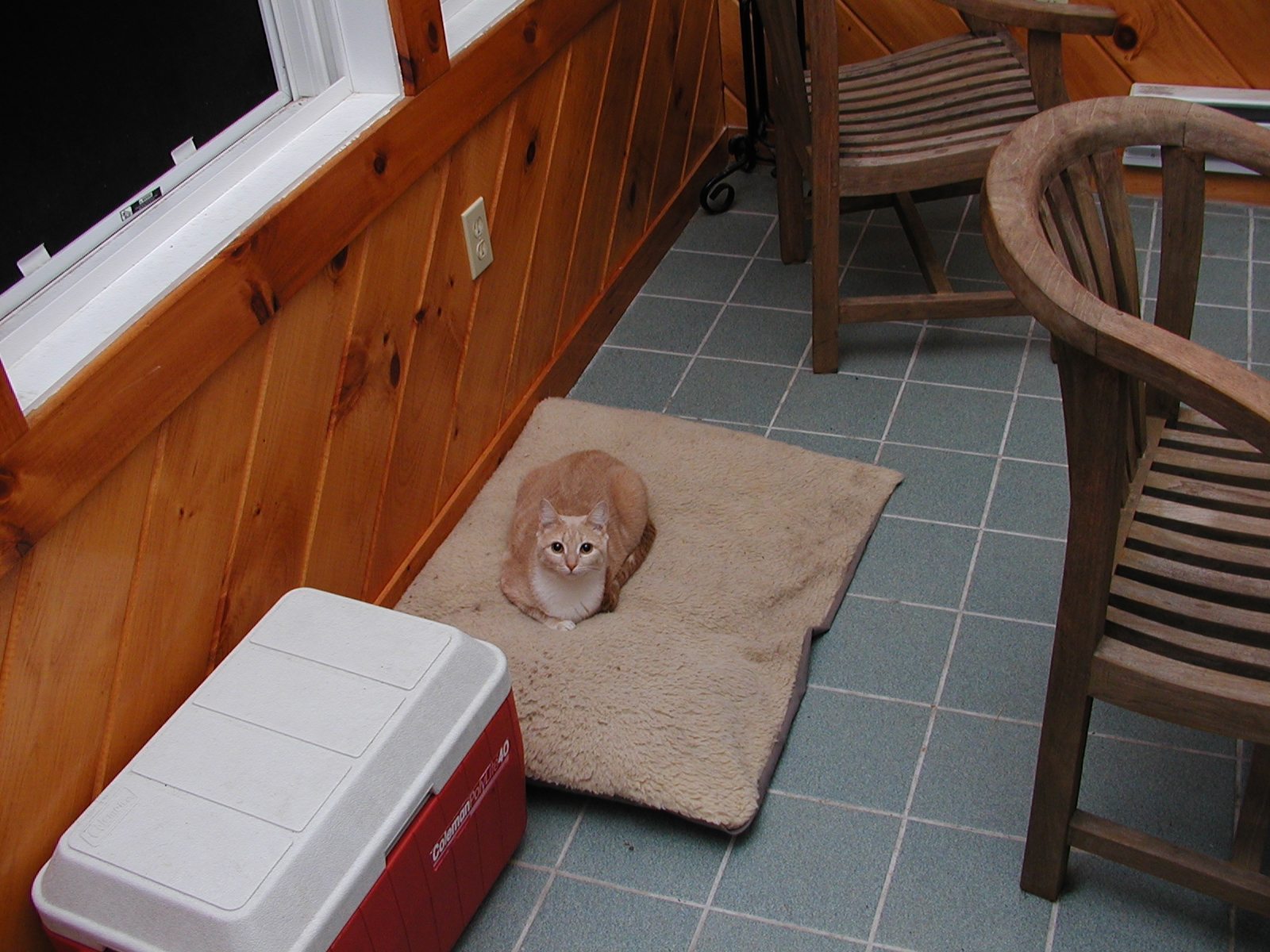 Picture #145: Abba ponders the great outdoors from the safety of the porch Small: 800x622, 91,759 bytes (90K), (html file) Large: 1600x1200, 1,416,356 bytes (1.4M), (html file) Copyright, Michael Meissner 2002, All rights reserved Olympus C-2100UZ camera f/5.0, ISO 100, 1/125 sec, 25.2mm, manual mode, SHQ, matrix metering 35mm equivalent focal length 140.0mm Taken by Michael Meissner on August 12, 2002 09:04:46 Last modified on August 12, 2002 at 23:28 Shutter speed of 1/125 or 1/250 may indicate use of flash |