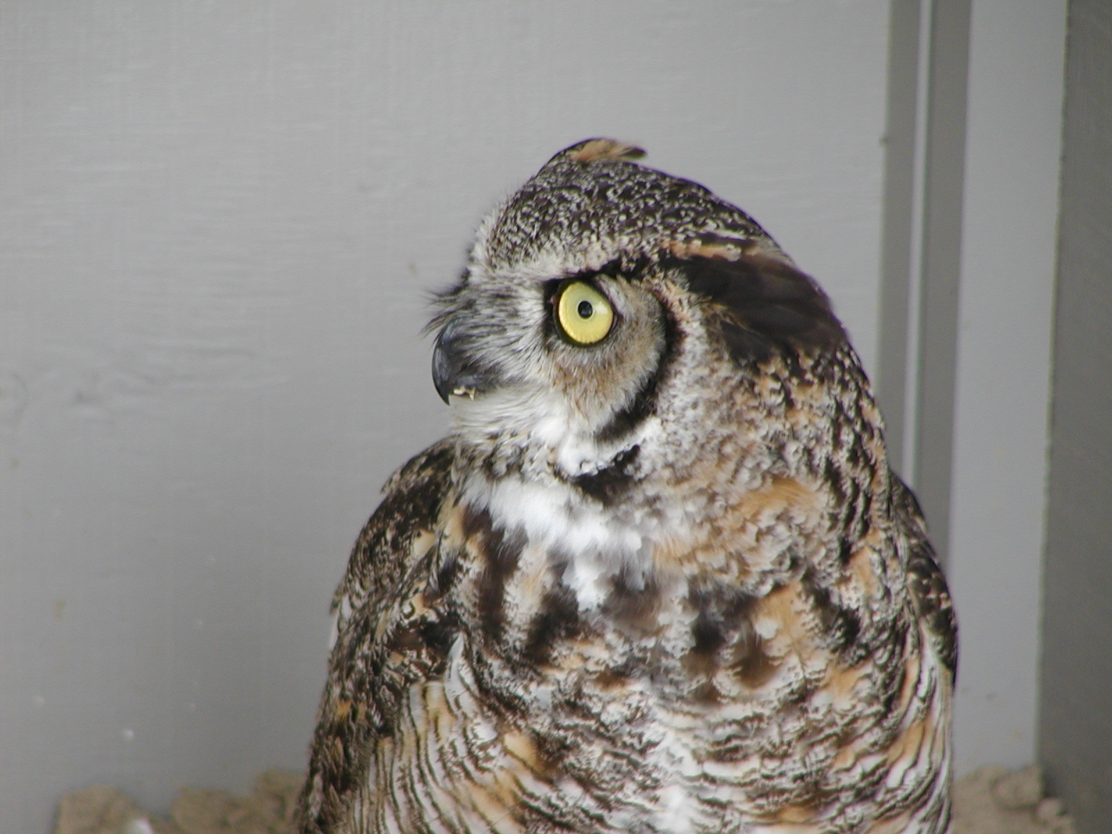 Picture #4: Great horned owl #4 Small: 800x622, 64,510 bytes (63K), (html file) Large: 1600x1200, 1,190,341 bytes (1.1M), (html file) Copyright, Michael Meissner 2002, All rights reserved Olympus C-2100UZ camera f/3.5, ISO 100, 1/200 sec, 70.0mm, s-prog mode, SHQ, matrix metering 35mm equivalent focal length 388.0mm Taken by Michael Meissner on July 04, 2002 10:59:14 Last modified on July 04, 2002 at 19:02 |