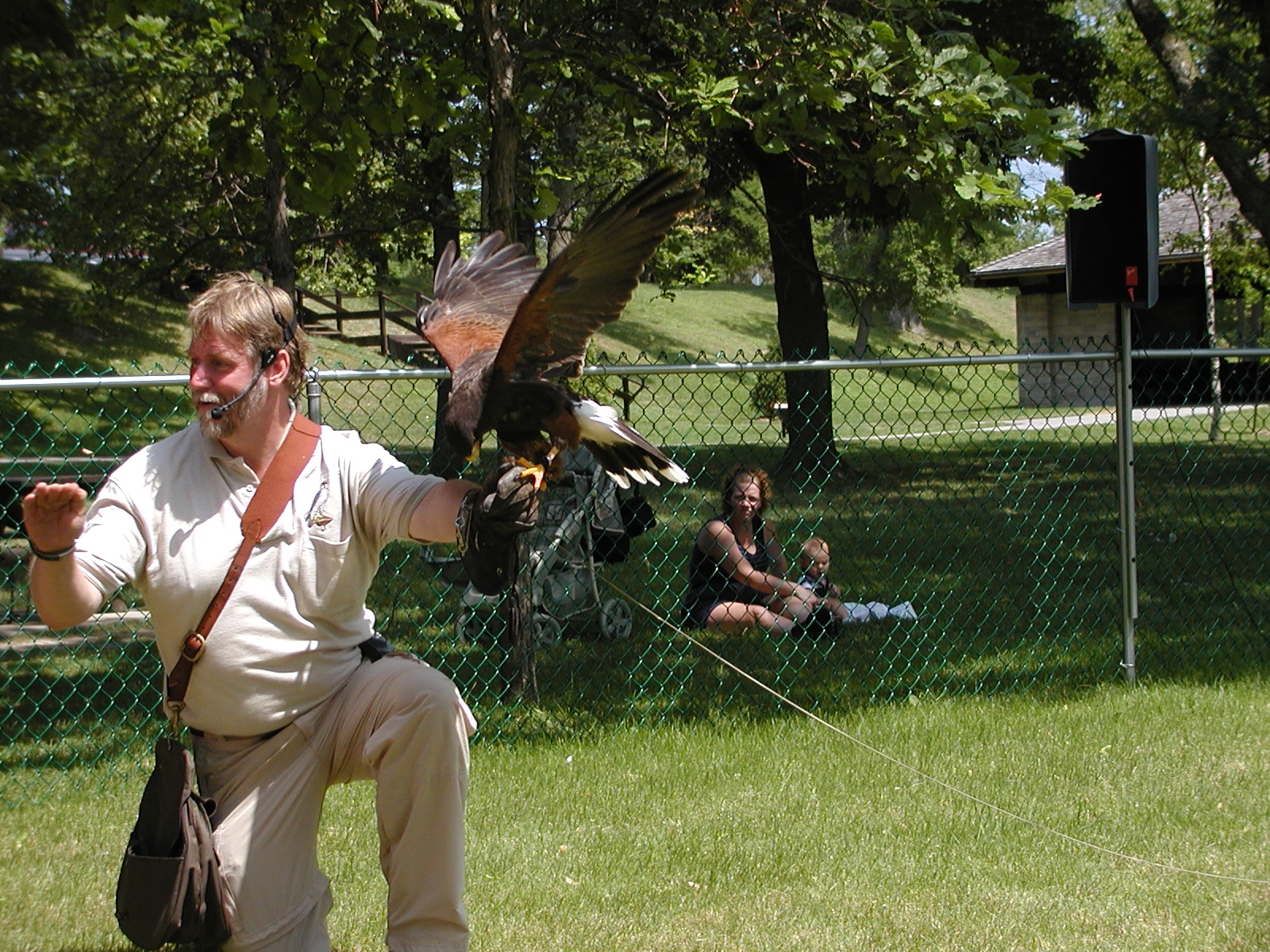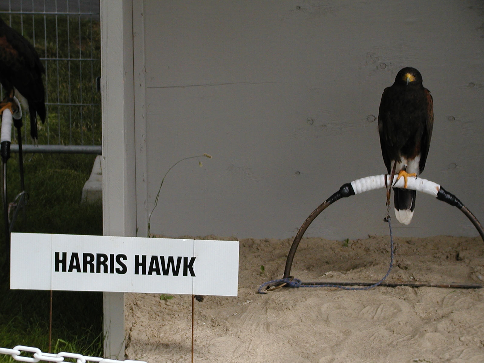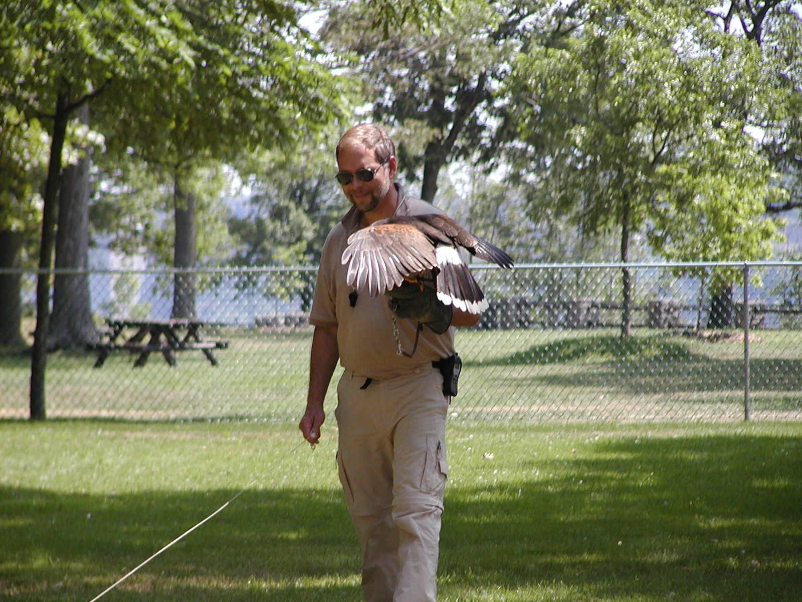 Picture #5: Harris hawk demonstration Small: 800x622, 114,307 bytes (112K), (html file) Large: 1600x1200, 1,526,922 bytes (1.5M), (html file) Copyright, Michael Meissner 2002, All rights reserved Olympus C-2100UZ camera f/2.8, ISO 100, 1/250 sec, 41.3mm, s-prog mode, SHQ, matrix metering 35mm equivalent focal length 229.0mm Taken by Michael Meissner on July 04, 2002 11:42:51 Last modified on July 09, 2002 at 12:53 Shutter speed of 1/125 or 1/250 may indicate use of flash |