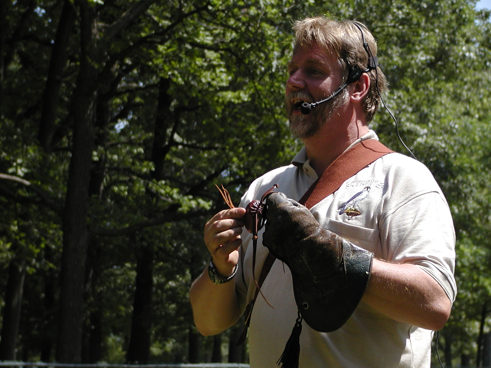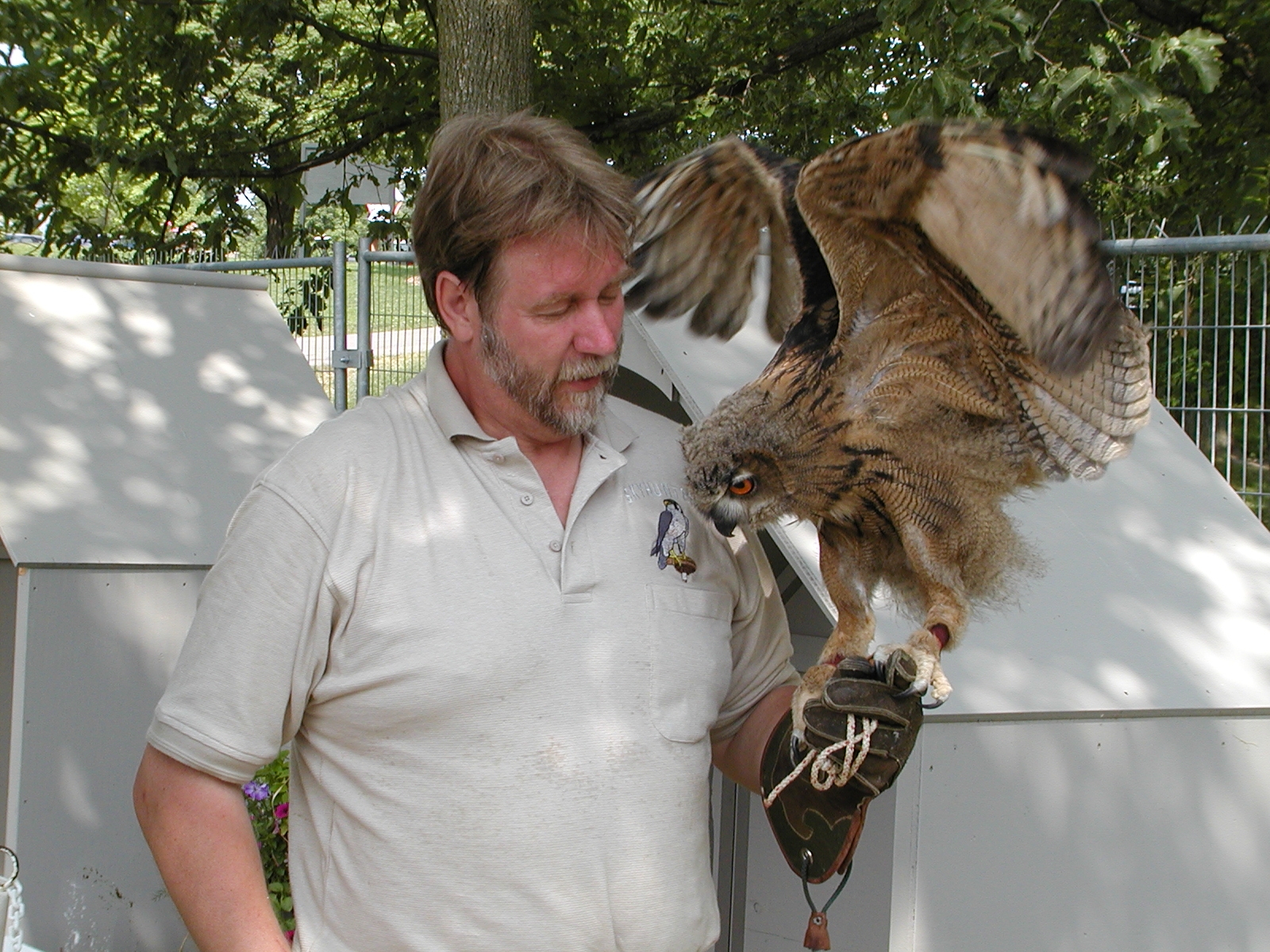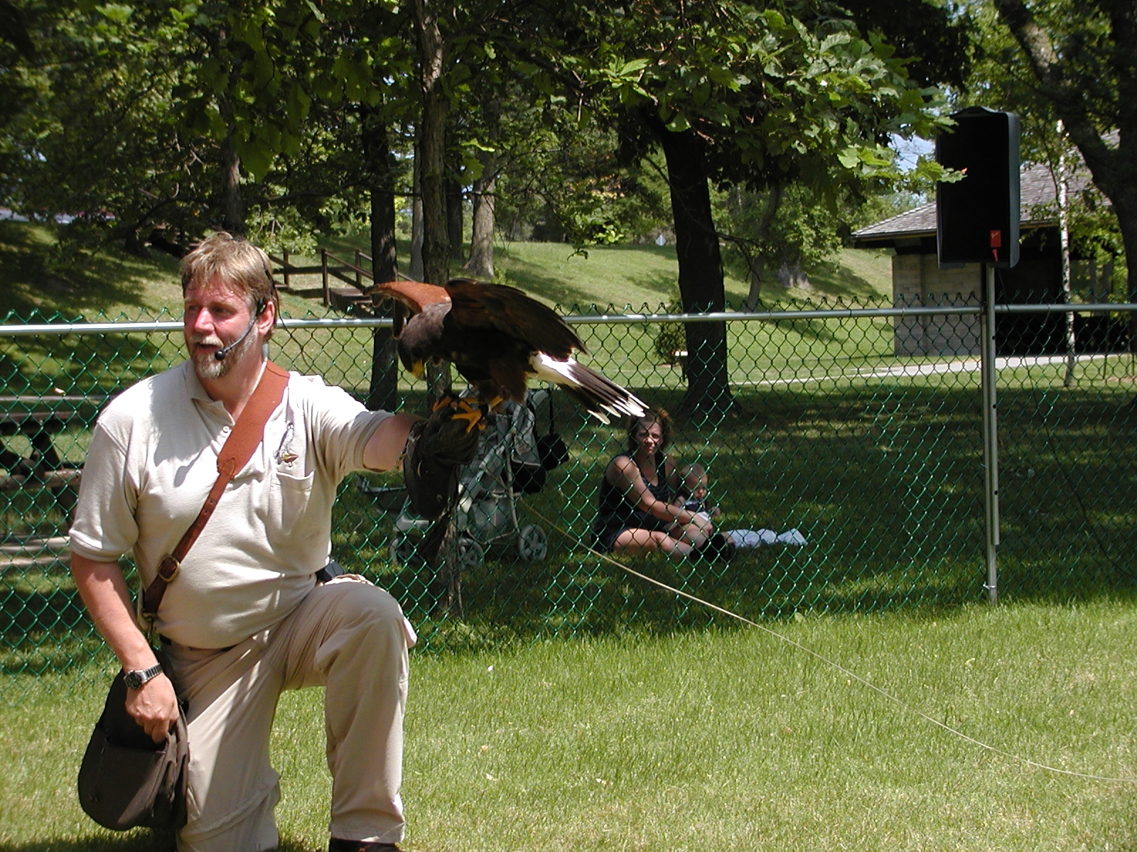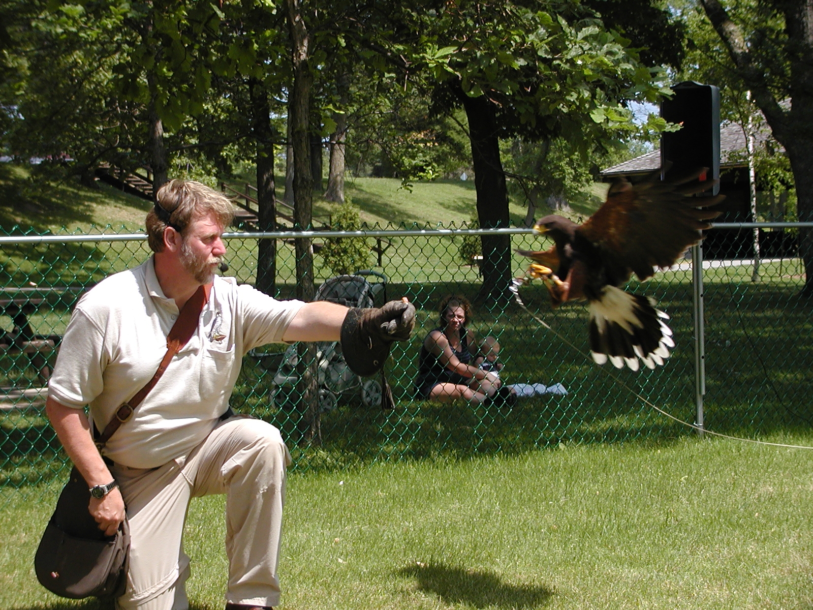 Picture #5: Harris hawk demonstration Small: 800x622, 114,307 bytes (112K), (html file) Large: 1600x1200, 1,526,922 bytes (1.5M), (html file) Copyright, Michael Meissner 2002, All rights reserved Olympus C-2100UZ camera f/2.8, ISO 100, 1/250 sec, 41.3mm, s-prog mode, SHQ, matrix metering 35mm equivalent focal length 229.0mm Taken by Michael Meissner on July 04, 2002 11:42:51 Last modified on July 09, 2002 at 12:53 Shutter speed of 1/125 or 1/250 may indicate use of flash |