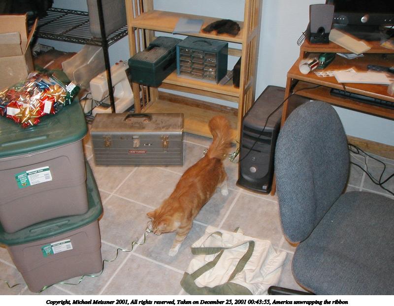 Picture #3: America unwrapping the ribbon 800x622, 86,137 bytes (85K), (html file) Copyright, Michael Meissner 2001, All rights reserved Olympus D-510Z camera f/2.8, ISO 200, flash, 1/30 sec, 5.6mm, auto mode, HQ, matrix metering 35mm equivalent focal length 37.0mm Taken by Michael Meissner on December 25, 2001 00:43:55 Last modified on June 06, 2002 at 22:39 |