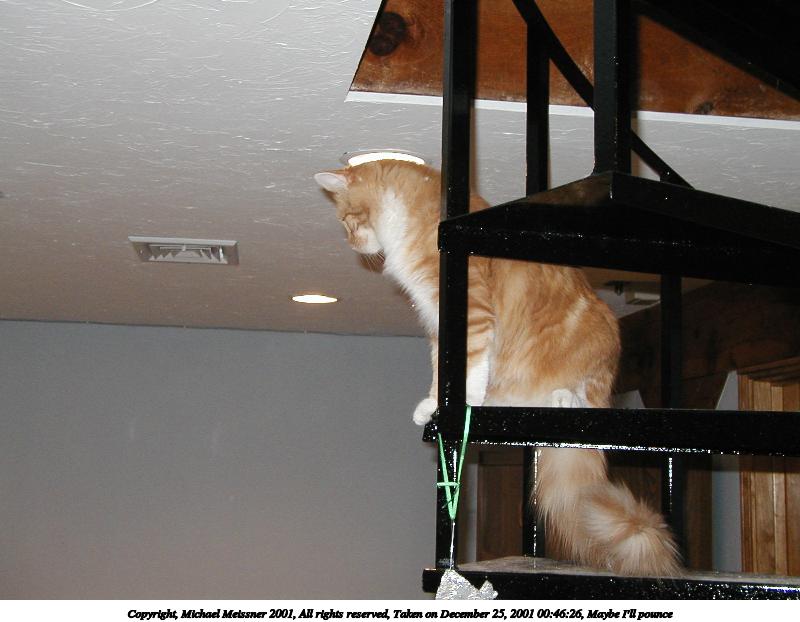 Picture #5: Maybe I'll pounce 800x622, 60,478 bytes (60K), (html file) Copyright, Michael Meissner 2001, All rights reserved Olympus D-510Z camera f/3.5, ISO 200, flash, 1/50 sec, 8.3mm, auto mode, HQ, matrix metering 35mm equivalent focal length 54.0mm Taken by Michael Meissner on December 25, 2001 00:46:26 Last modified on June 06, 2002 at 22:39 |