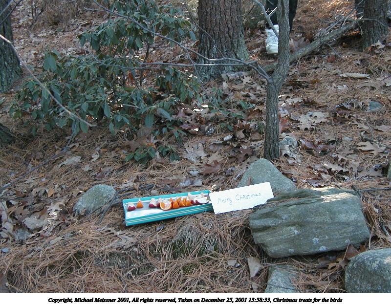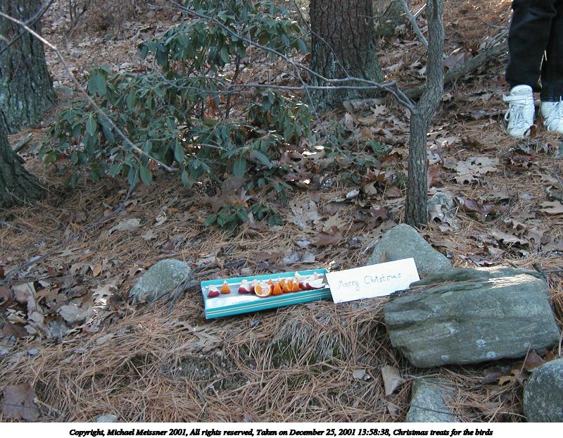 Picture #11: Christmas treats for the birds #3 800x622, 155,343 bytes (152K), (html file) Copyright, Michael Meissner 2001, All rights reserved Olympus D-510Z camera f/3.7, ISO 174, 1/50 sec, 8.9mm, auto mode, HQ, matrix metering 35mm equivalent focal length 58.0mm Taken by Michael Meissner on December 25, 2001 13:58:33 Last modified on June 06, 2002 at 22:39 |