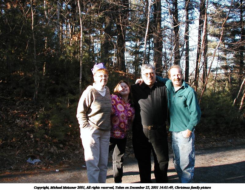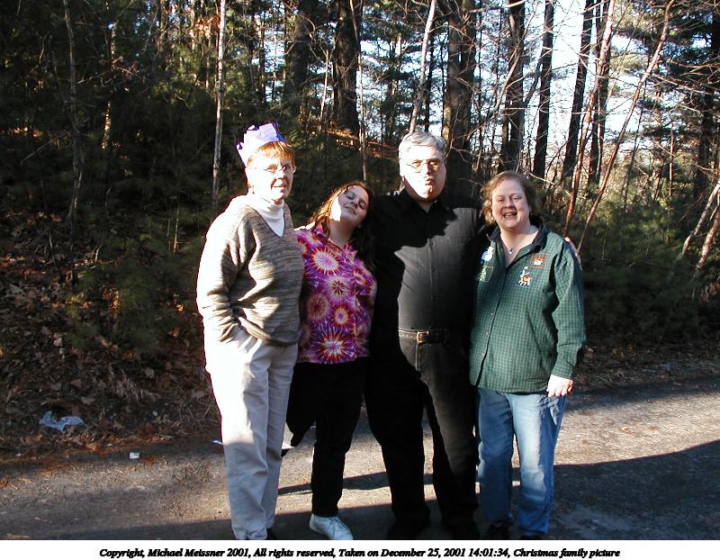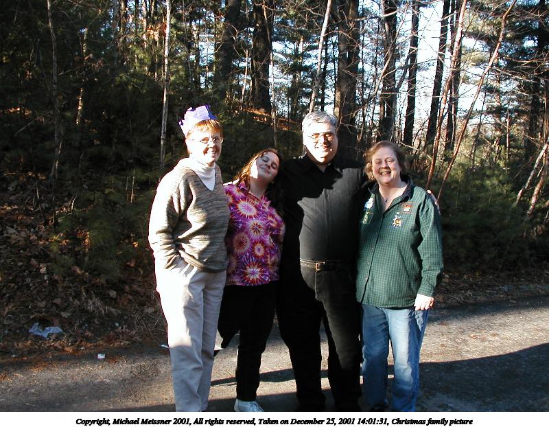 Picture #1: Christmas family picture 800x622, 133,986 bytes (131K), (html file) Copyright, Michael Meissner 2001, All rights reserved Olympus D-510Z camera f/2.8, ISO 100, 1/160 sec, 5.6mm, auto mode, HQ, matrix metering 35mm equivalent focal length 37.0mm Taken by Michael Meissner on December 25, 2001 14:01:31 Last modified on June 06, 2002 at 22:39 |