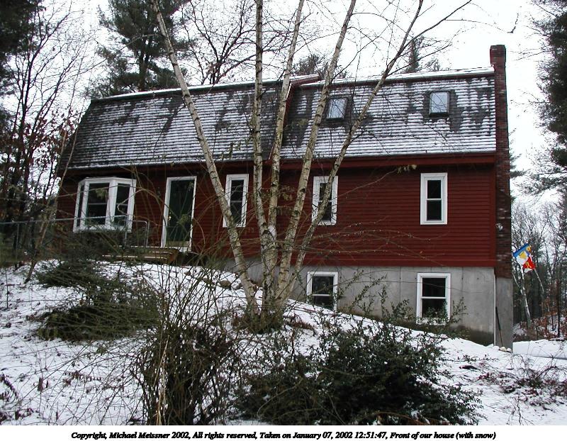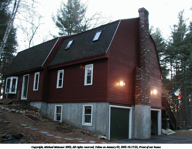 Picture #1: Front of our house 800x622, 103,124 bytes (101K), (html file) Copyright, Michael Meissner 2002, All rights reserved Olympus D-510Z camera f/2.8, ISO 200, 1/25 sec, 5.6mm, auto mode, HQ, matrix metering 35mm equivalent focal length 37.0mm Taken by Michael Meissner on January 03, 2002 16:17:22 Last modified on June 06, 2002 at 22:39 |