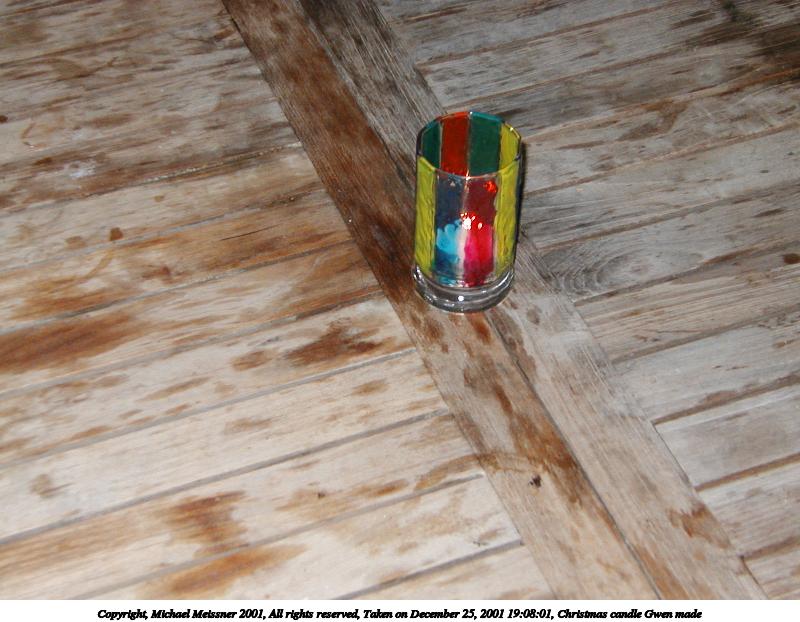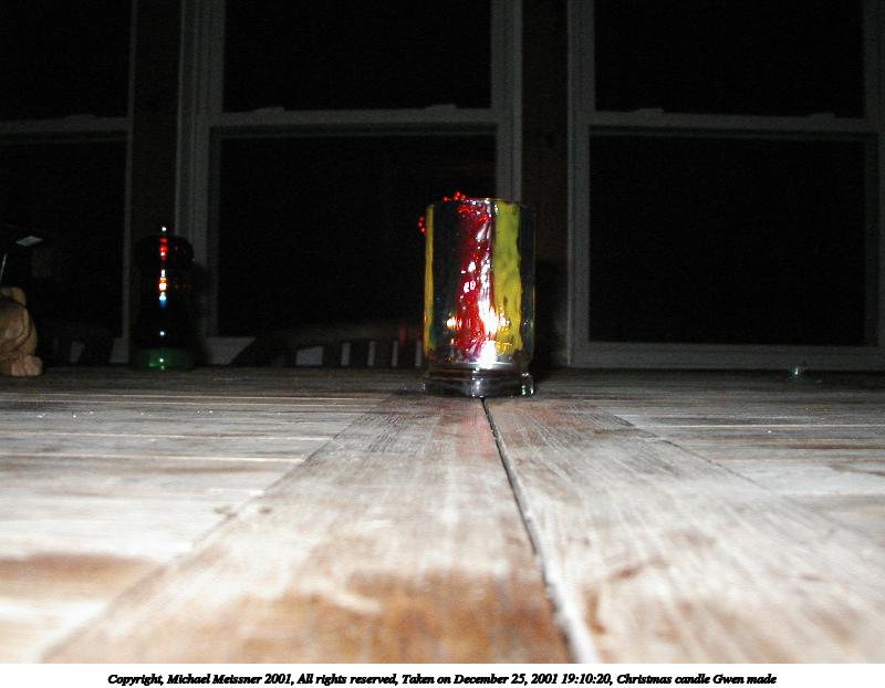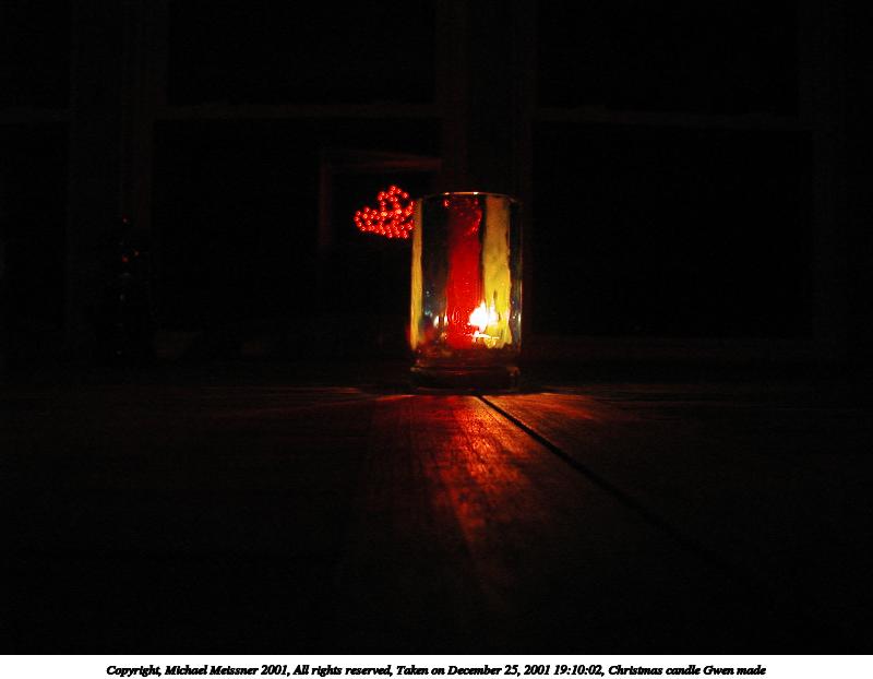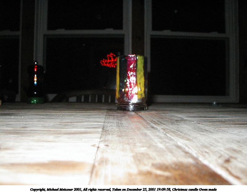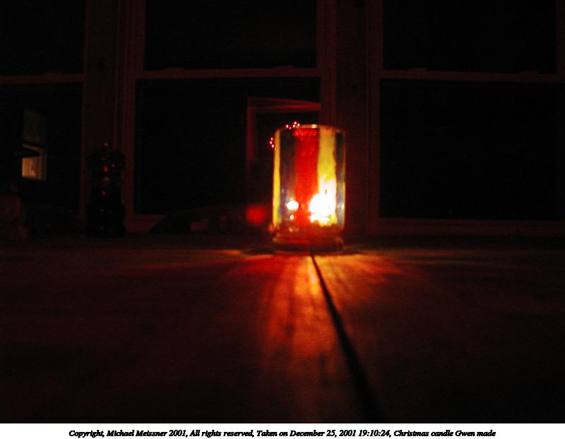 Picture #14: Christmas candle Gwen made #2 800x622, 96,354 bytes (95K), (html file) Copyright, Michael Meissner 2001, All rights reserved Olympus D-510Z camera f/4.4, ISO 200, flash, 1/100 sec, 15.7mm, auto mode, HQ, matrix metering 35mm equivalent focal length 102.0mm Taken by Michael Meissner on December 25, 2001 19:08:10 Last modified on June 06, 2002 at 22:39 |