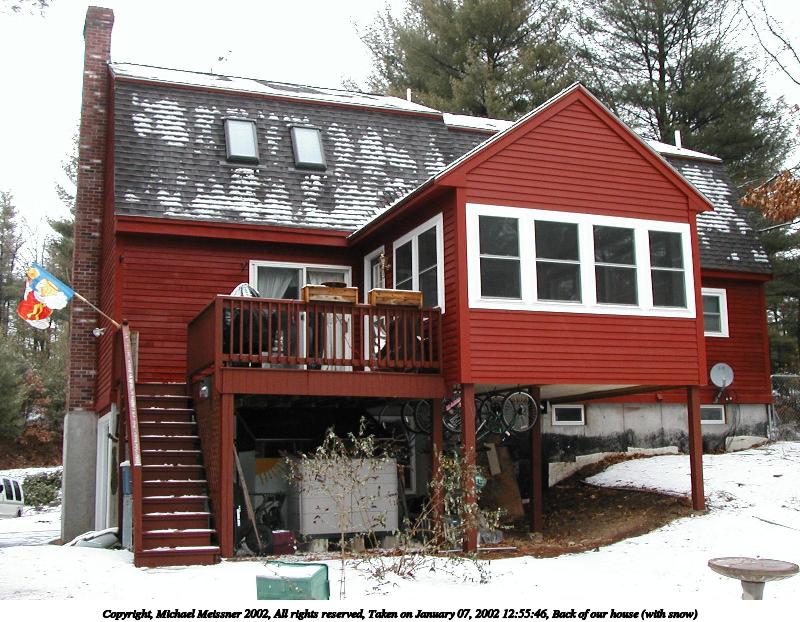 Picture #3: Back of our house (with snow) 800x622, 121,391 bytes (119K), (html file) Copyright, Michael Meissner 2002, All rights reserved Olympus D-510Z camera f/3.0, ISO 100, 1/60 sec, 6.4mm, auto mode, HQ, matrix metering 35mm equivalent focal length 42.0mm Taken by Michael Meissner on January 07, 2002 12:55:46 Last modified on June 06, 2002 at 22:39 |