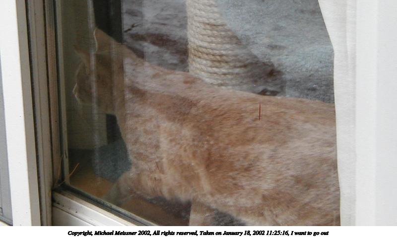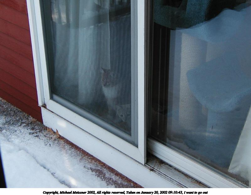 Picture #8: I want to go out #2 800x659, 64,198 bytes (63K), (html file) Copyright, Michael Meissner 2002, All rights reserved Olympus D-510Z camera f/4.4, ISO 139, 1/100 sec, 15.7mm, auto mode, SHQ, spot metering 35mm equivalent focal length 102.0mm Taken by Michael Meissner on January 18, 2002 11:25:34 Last modified on June 06, 2002 at 22:39 |