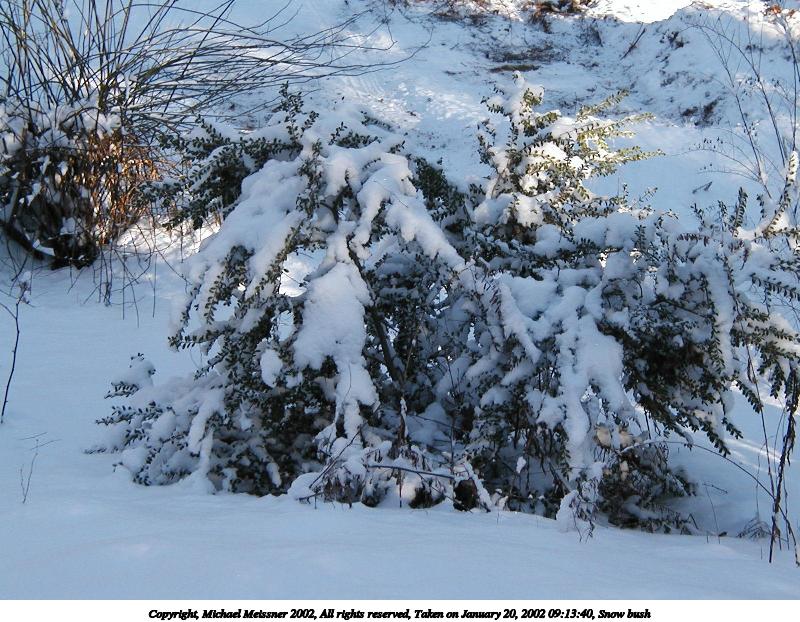 Picture #3: Snow bush 800x622, 127,390 bytes (125K), (html file) Copyright, Michael Meissner 2002, All rights reserved Olympus D-510Z camera f/4.4, ISO 100, 1/200 sec, 15.7mm, auto mode, HQ, sunny, matrix metering 35mm equivalent focal length 102.0mm Taken by Michael Meissner on January 20, 2002 09:13:40 Last modified on June 06, 2002 at 22:39 |