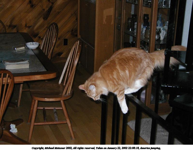Picture #6: America jumping, 800x622, 69,316 bytes (68K), (html file) Copyright, Michael Meissner 2002, All rights reserved Olympus D-510Z camera f/3.6, ISO 185, flash, 1/50 sec, 8.7mm, auto mode, HQ, matrix metering 35mm equivalent focal length 57.0mm Taken by Michael Meissner on January 22, 2002 22:08:18 Last modified on June 06, 2002 at 22:39 |