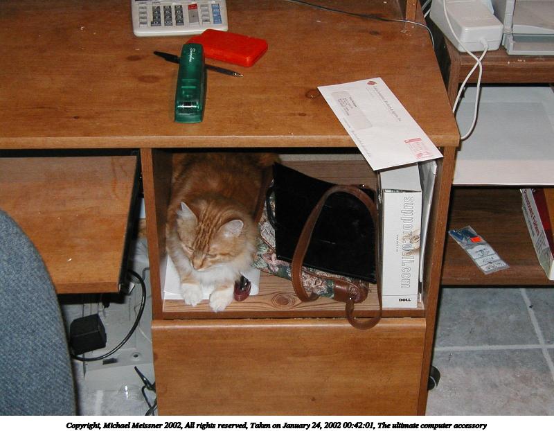 Picture #12: The ultimate computer accessory 800x622, 81,926 bytes (81K), (html file) Copyright, Michael Meissner 2002, All rights reserved Olympus D-510Z camera f/3.8, ISO 200, flash, 1/50 sec, 10.1mm, auto mode, HQ, matrix metering 35mm equivalent focal length 66.0mm Taken by Michael Meissner on January 24, 2002 00:42:01 Last modified on June 06, 2002 at 22:39 |