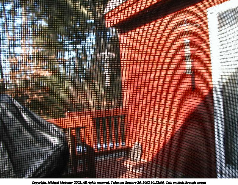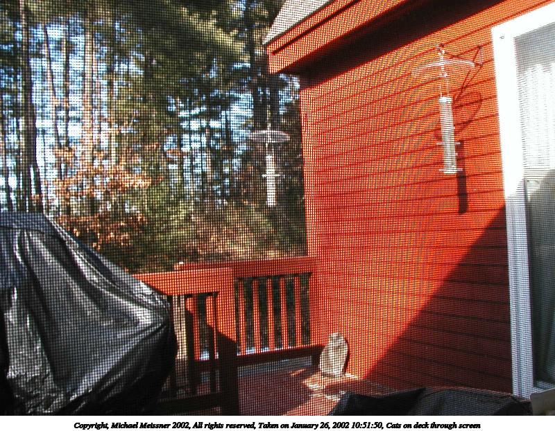 Picture #14: Cats on deck through screen #2 800x622, 184,672 bytes (181K), (html file) Copyright, Michael Meissner 2002, All rights reserved Olympus D-510Z camera f/2.8, ISO 100, 1/160 sec, 5.6mm, auto mode, HQ, matrix metering 35mm equivalent focal length 37.0mm Taken by Michael Meissner on January 26, 2002 10:52:06 Last modified on June 06, 2002 at 22:39 |