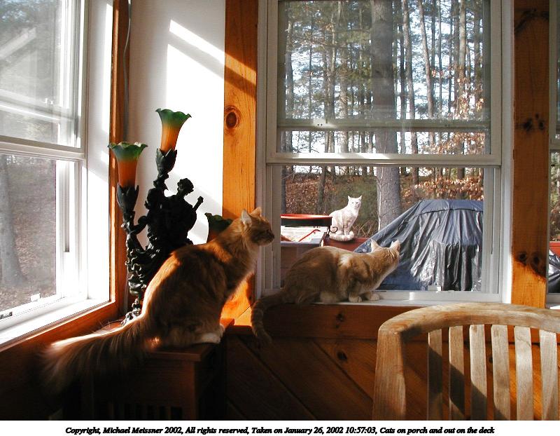 Picture #16: Cats on porch and out on the deck #2 800x622, 102,450 bytes (101K), (html file) Copyright, Michael Meissner 2002, All rights reserved Olympus D-510Z camera f/2.8, ISO 100, 1/100 sec, 5.6mm, auto mode, HQ, matrix metering 35mm equivalent focal length 37.0mm Taken by Michael Meissner on January 26, 2002 10:57:14 Last modified on June 06, 2002 at 22:39 |