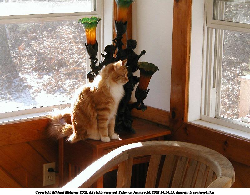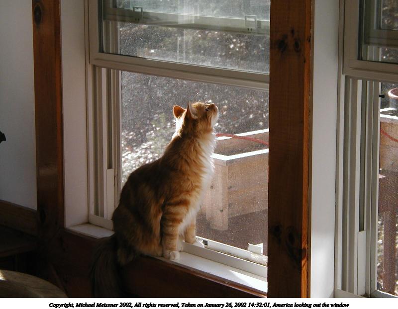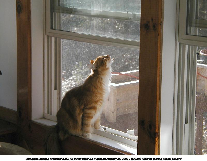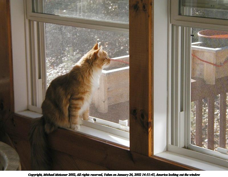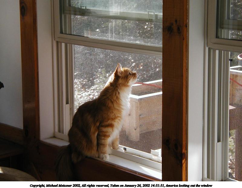 Picture #20: America looking out the window #3 800x622, 69,648 bytes (69K), (html file) Copyright, Michael Meissner 2002, All rights reserved Olympus D-510Z camera f/4.4, ISO 100, 1/125 sec, 15.7mm, auto mode, HQ, spot metering 35mm equivalent focal length 102.0mm Taken by Michael Meissner on January 26, 2002 14:32:01 Last modified on June 06, 2002 at 22:39 |