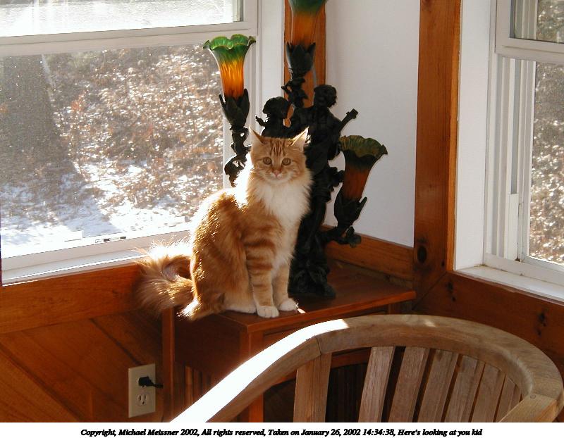 Picture #23: Here's looking at you kid 800x622, 86,242 bytes (85K), (html file) Copyright, Michael Meissner 2002, All rights reserved Olympus D-510Z camera f/4.4, ISO 100, flash, 1/100 sec, 15.7mm, auto mode, HQ, spot metering 35mm equivalent focal length 102.0mm Taken by Michael Meissner on January 26, 2002 14:34:38 Last modified on June 06, 2002 at 22:39 |