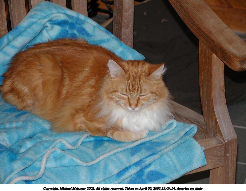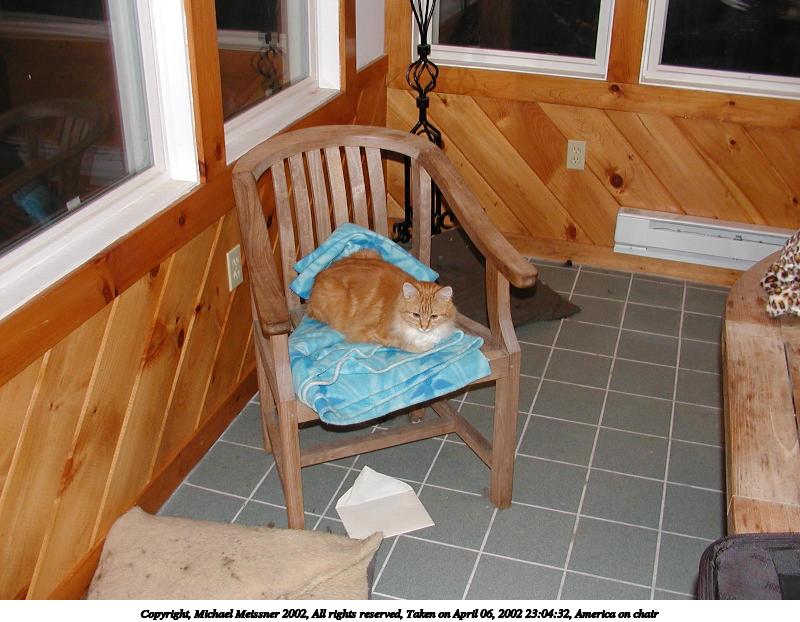 Picture #83: America on chair #2 800x622, 86,671 bytes (85K), (html file) Copyright, Michael Meissner 2002, All rights reserved Olympus C-2100UZ camera f/2.8, ISO 112, flash, 1/30 sec, 7.0mm, auto mode, SHQ, matrix metering 35mm equivalent focal length 39.0mm Taken by Michael Meissner on April 06, 2002 23:04:47 Last modified on May 29, 2002 at 21:30 |