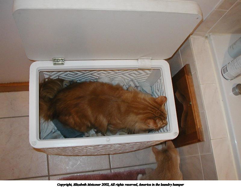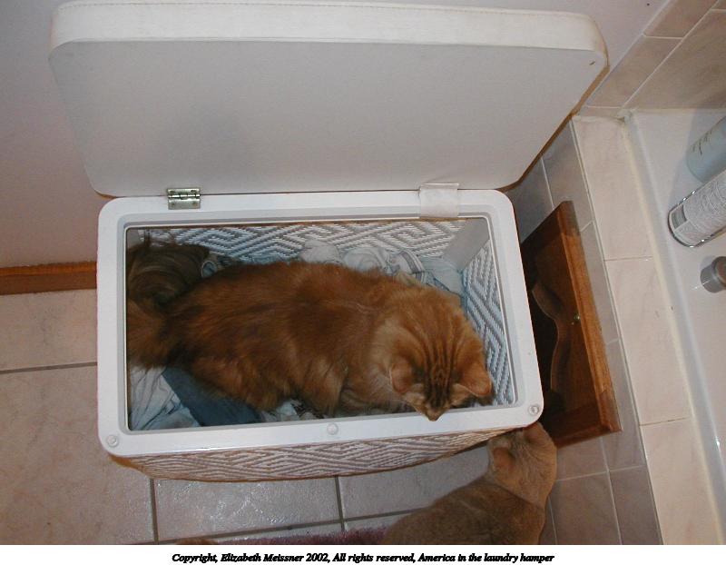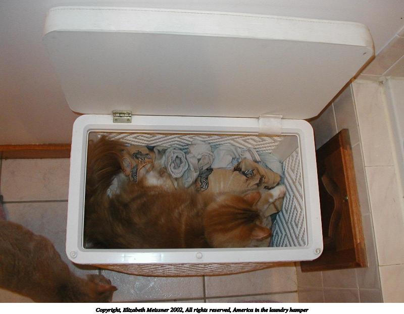Picture #75: America in the laundry hamper #3 800x622, 60,147 bytes (59K), (html file) Copyright, Elizabeth Meissner 2002, All rights reserved Olympus D-510Z camera f/2.8, ISO 200, flash, 1/30 sec, 5.6mm, auto mode, HQ, matrix metering 35mm equivalent focal length 37.0mm Taken by Elizabeth Meissner Last modified on May 29, 2002 at 21:30 |