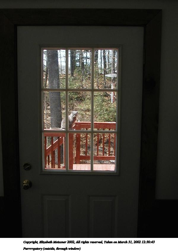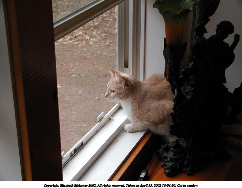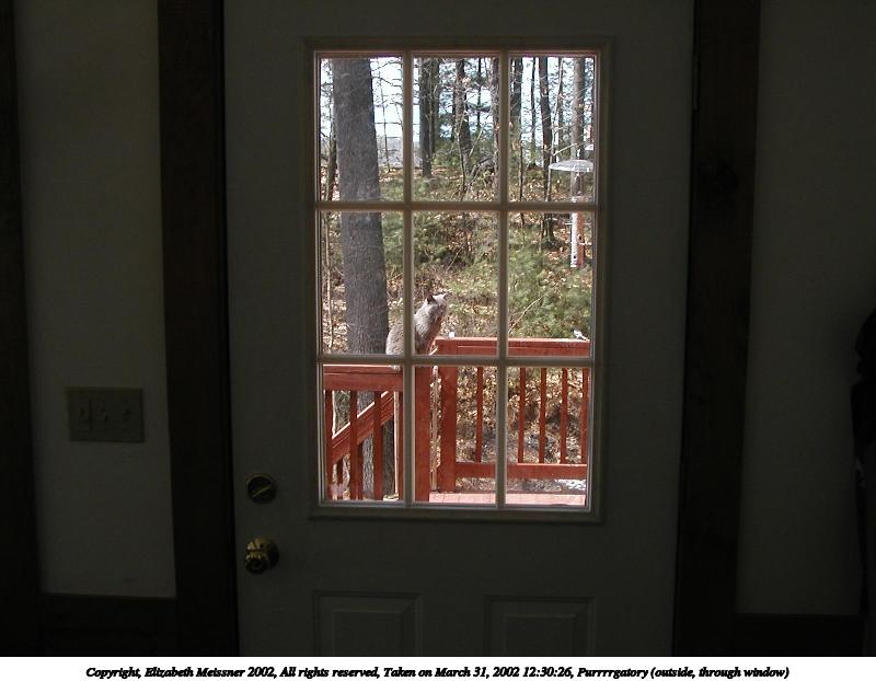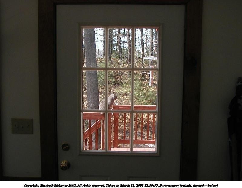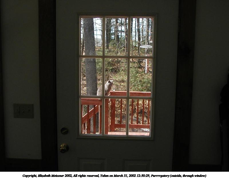 Picture #79: Purrrrgatory (outside, through window) #3 800x622, 61,797 bytes (61K), (html file) Copyright, Elizabeth Meissner 2002, All rights reserved Olympus D-510Z camera f/3.0, ISO 100, 1/250 sec, 6.4mm, auto mode, SHQ, spot metering 35mm equivalent focal length 42.0mm Taken by Elizabeth Meissner on March 31, 2002 12:30:35 Last modified on May 29, 2002 at 21:30 |