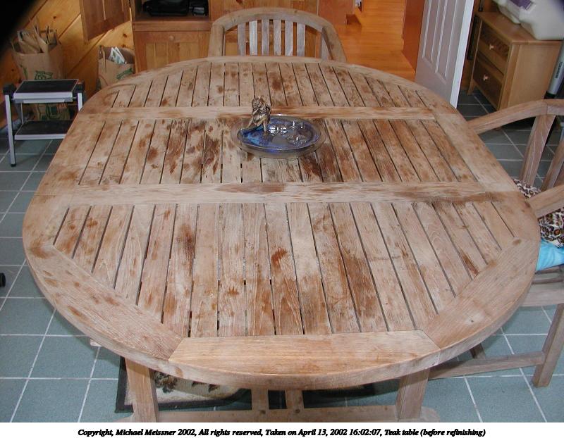 Picture #67: Teak table (before refinishing) 800x622, 93,911 bytes (92K), (html file) Copyright, Michael Meissner 2002, All rights reserved Olympus C-2100UZ camera f/2.8, ISO 100, flash, 1/30 sec, 7.0mm, auto mode, SHQ, matrix metering 35mm equivalent focal length 39.0mm Taken by Michael Meissner on April 13, 2002 16:02:07 Last modified on May 29, 2002 at 21:30 |