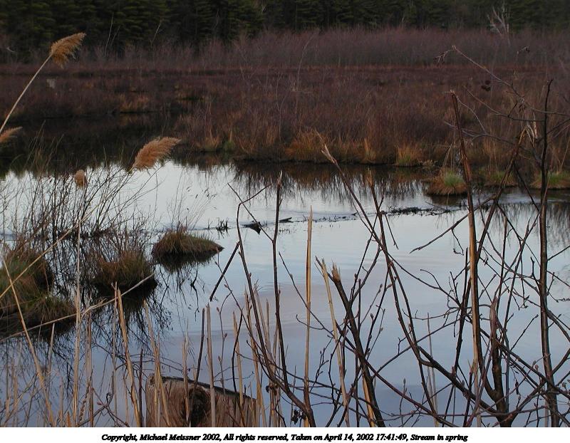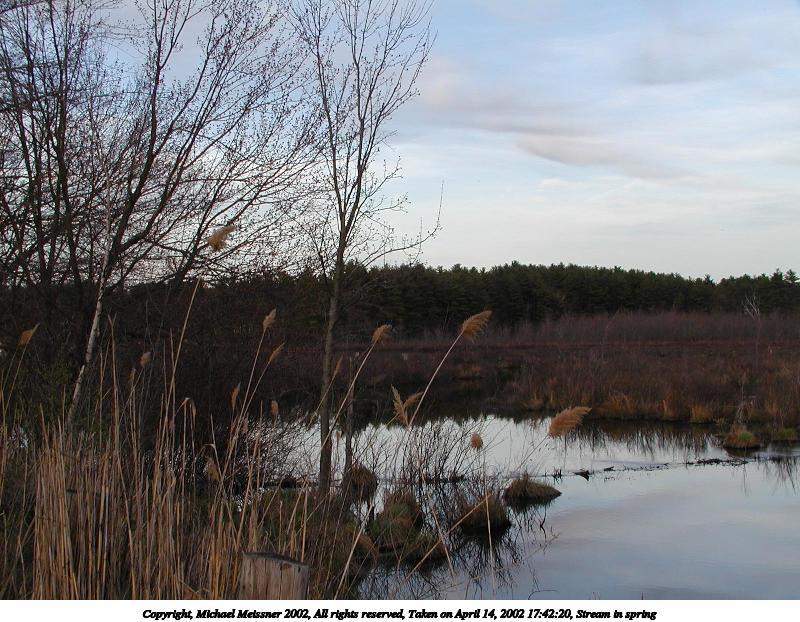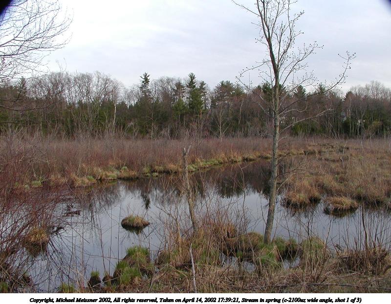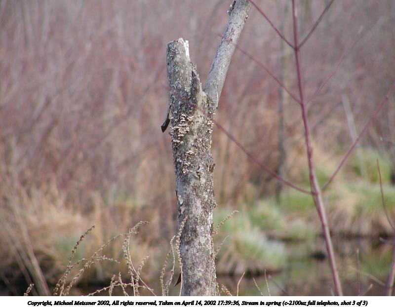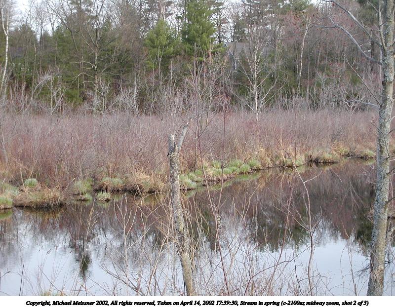 Picture #53: Stream in spring (c-2100uz midway zoom, shot 2 of 3) 800x622, 147,706 bytes (145K), (html file) Copyright, Michael Meissner 2002, All rights reserved Olympus C-2100UZ camera f/2.8, ISO 100, 1/100 sec, 15.7mm, shutter priority, SHQ, matrix metering 35mm equivalent focal length 87.0mm Taken by Michael Meissner on April 14, 2002 17:39:30 Last modified on May 29, 2002 at 21:30 |