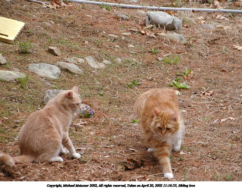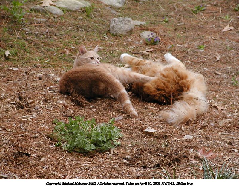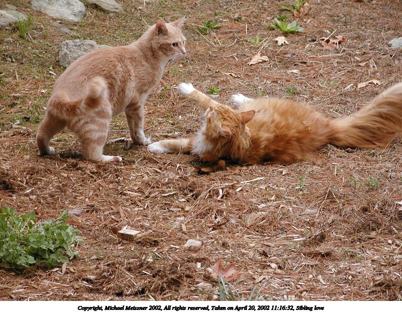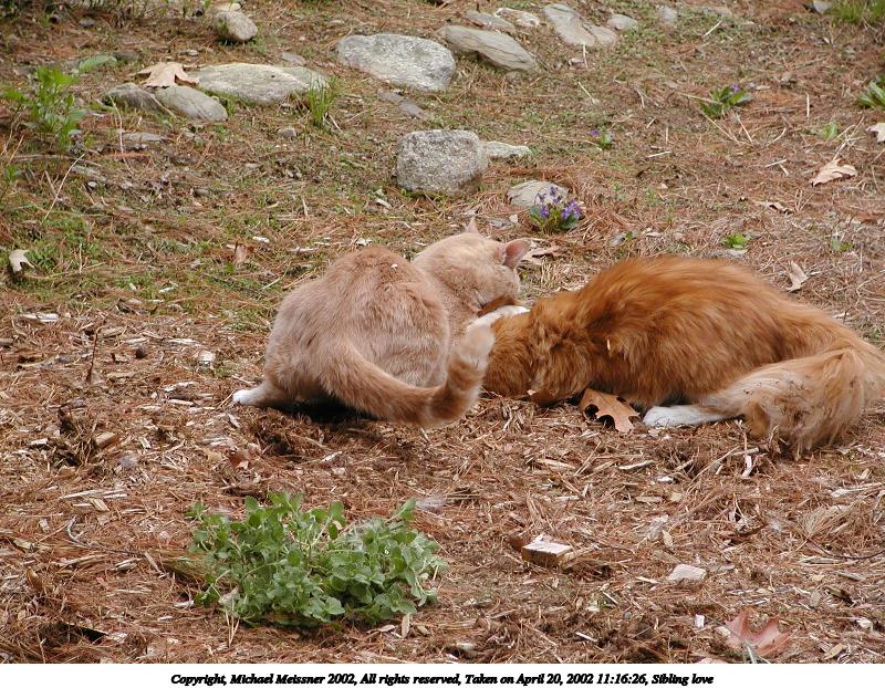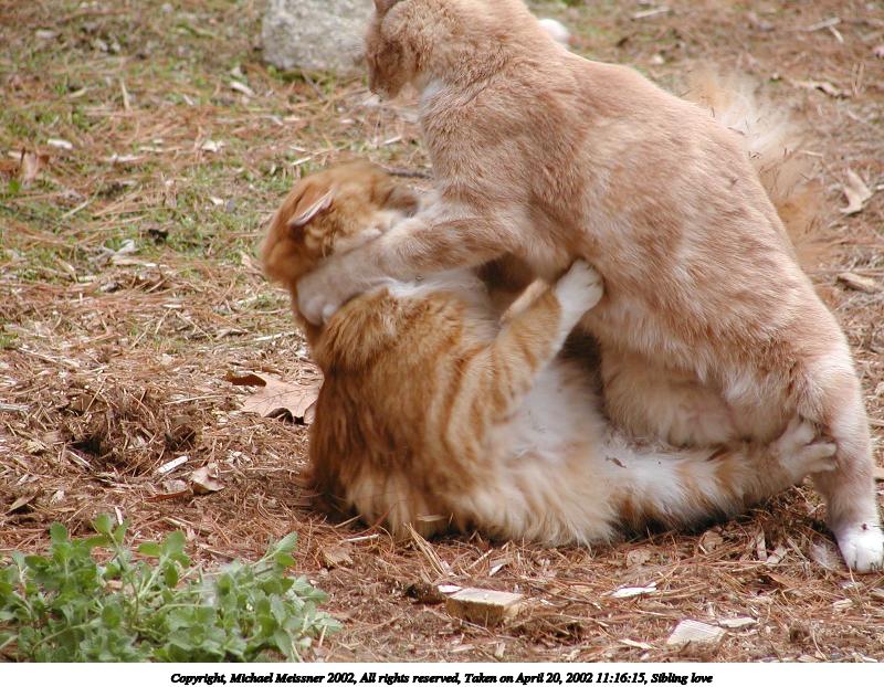 Picture #22: Sibling love #7 800x622, 167,806 bytes (164K), (html file) Copyright, Michael Meissner 2002, All rights reserved Olympus C-2100UZ camera f/2.8, ISO 100, 1/250 sec, 31.1mm, auto mode, SHQ, spot metering 35mm equivalent focal length 173.0mm Taken by Michael Meissner on April 20, 2002 11:16:53 Last modified on May 29, 2002 at 21:30 Shutter speed of 1/125 or 1/250 may indicate use of flash |
