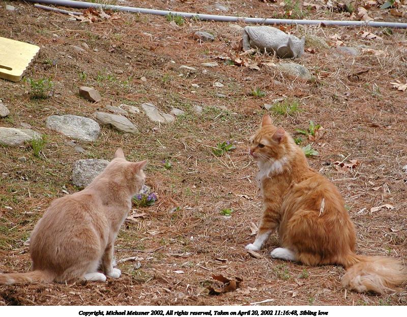 Picture #28: Sibling love 800x622, 116,947 bytes (115K), (html file) Copyright, Michael Meissner 2002, All rights reserved Olympus C-2100UZ camera f/2.8, ISO 100, 1/400 sec, 48.3mm, auto mode, SHQ, matrix metering 35mm equivalent focal length 268.0mm Taken by Michael Meissner on April 20, 2002 11:16:09 Last modified on May 29, 2002 at 21:30 |