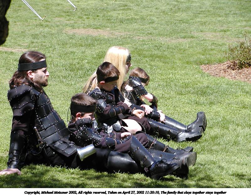 Picture #4: The family that slays together stays together 800x622, 159,050 bytes (156K), (html file) Copyright, Michael Meissner 2002, All rights reserved Olympus C-2100UZ camera f/3.5, ISO 100, 1/800 sec, 27.3mm, s-prog mode, SHQ, matrix metering 35mm equivalent focal length 151.0mm Taken by Michael Meissner on April 27, 2002 11:20:10 Last modified on May 29, 2002 at 21:30 |