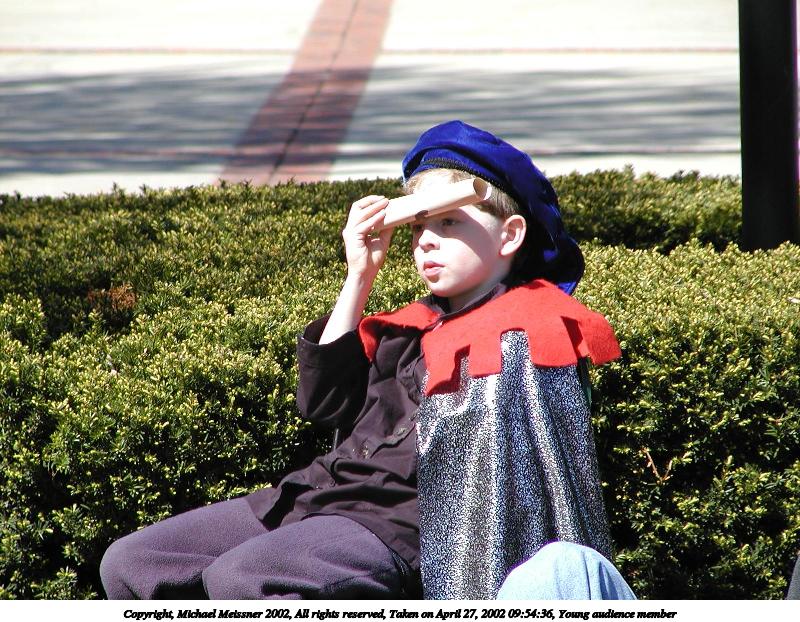 Picture #1: Young audience member 800x622, 143,081 bytes (140K), (html file) Copyright, Michael Meissner 2002, All rights reserved Olympus C-2100UZ camera f/3.5, ISO 100, 1/800 sec, 54.0mm, s-prog mode, SHQ, matrix metering 35mm equivalent focal length 300.0mm Taken by Michael Meissner on April 27, 2002 09:54:36 Last modified on May 29, 2002 at 21:30 |