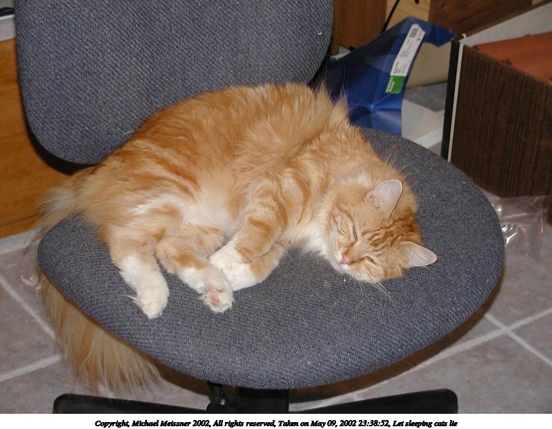 Picture #134: Let sleeping cats lie 728x782, 84,181 bytes (83K), (html file) Copyright, Michael Meissner 2002, All rights reserved Olympus C-2100UZ camera f/2.8, ISO 100, 1/6 sec, 7.7mm, auto mode, SHQ, matrix metering 35mm equivalent focal length 43.0mm Taken by Michael Meissner on May 09, 2002 23:33:39 Last modified on May 29, 2002 at 21:30 |