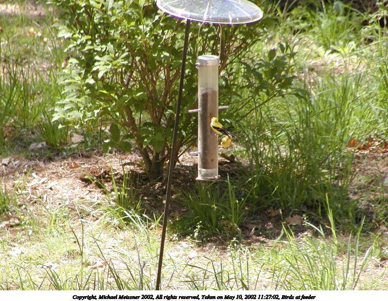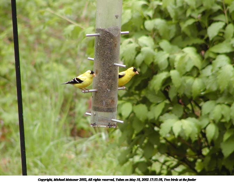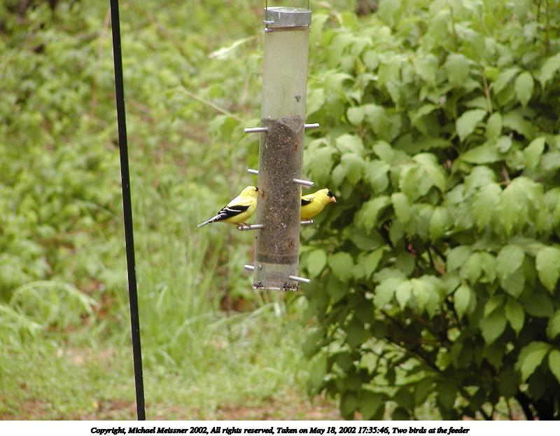 Picture #70: Two birds at the feeder 800x622, 67,947 bytes (67K), (html file) Copyright, Michael Meissner 2002, All rights reserved Olympus C-2100UZ camera f/3.5, ISO 100, 1/80 sec, 70.0mm, auto mode, SHQ, matrix metering 35mm equivalent focal length 388.0mm Taken by Michael Meissner on May 18, 2002 17:35:38 Last modified on May 29, 2002 at 21:31 |